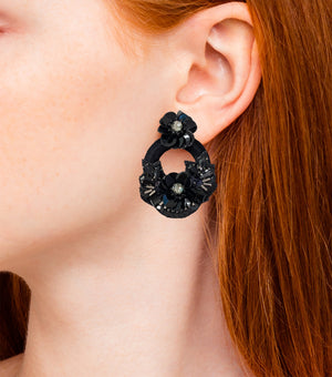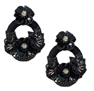 Flatter your features with our Poppies & Pups earrings. These earrings are a stunning garland of beading and sequin petals that are sewn onto a woven hoop for an elegant finish. The lovely thing about our flower hoop earrings is that they can enhance a casual look to a chic fashion style.