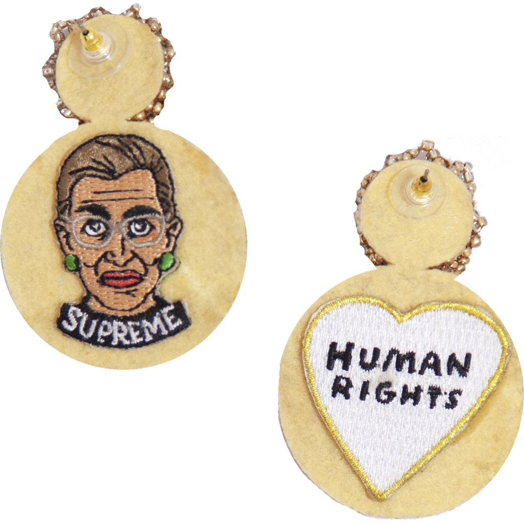 Make a powerful statement with the Golden Thumb Earrings! These bold earrings combine intricate gold beading, pearly accents, and a striking "RBG/Human Rights" patch design on the back. Weighing just 11 grams (as light as a set of headphones!), they’re the perfect accessory for those who want to mix elegance with empowerment.