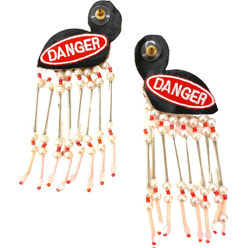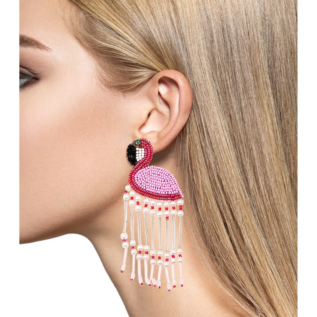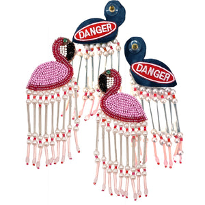 🎨 Vibrant Design: These pink flamingo earrings with a bold "Danger" sign are crafted with intricate beading and fringe, making them a standout piece in any jewelry collection.