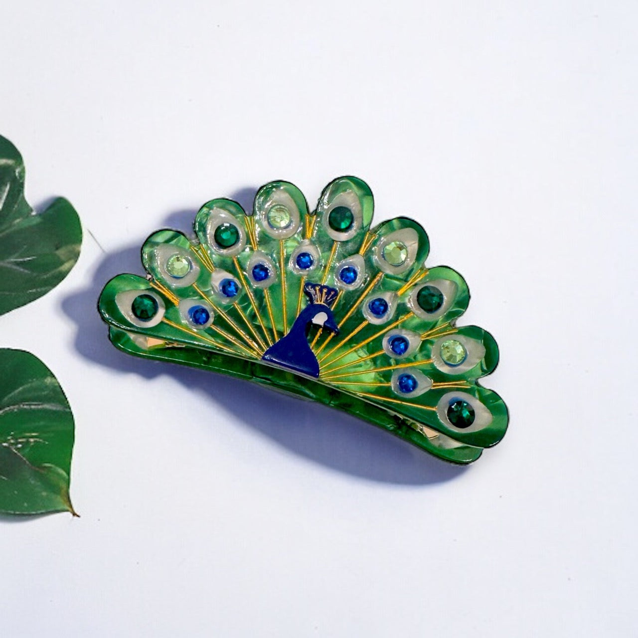 🦚 Peacock-Inspired Opulence: Exquisite peacock-shaped hair clip adorned with intricate detailing, shimmering stones, and vibrant feathers, evoking the grandeur of nature's avian masterpiece.