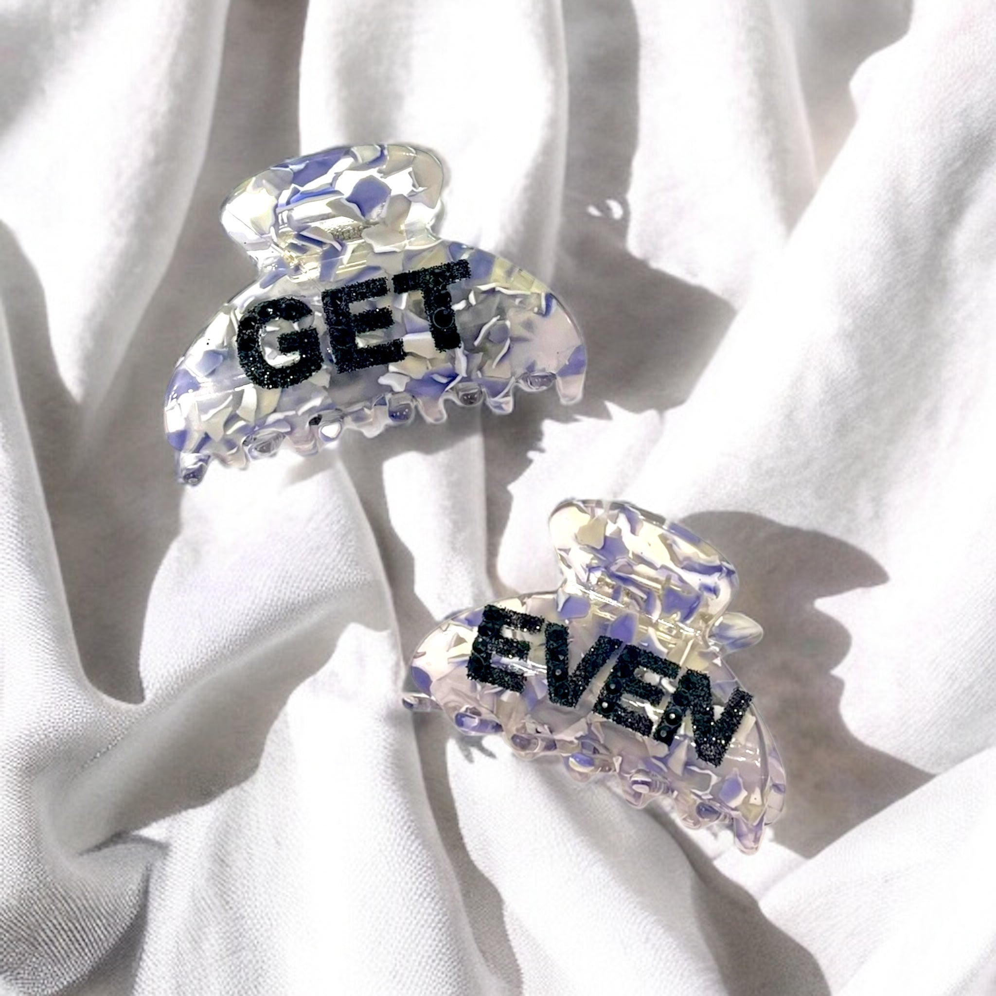 Make a bold fashion statement with the "Get Even" Hair Clip. Featuring iridescent material and black glitter letters, this claw clip is perfect for adding a playful touch to any hairstyle. Designed to hold thick hair securely, it combines both style and functionality, making it an ideal accessory for everyday or special occasions.