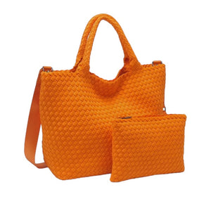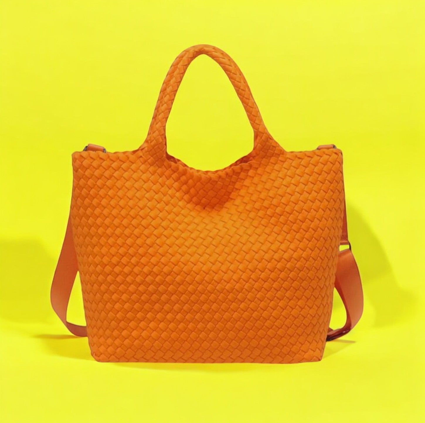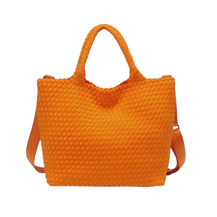 Carry your essentials in style with the Basketweave Orange Tote - Medium! This vibrant orange tote, crafted from durable neoprene, features a unique basketweave design that adds a playful touch to any outfit. Spacious and lightweight, it’s the perfect companion for a day at the beach or a casual picnic. With ample room for your belongings, this tote combines fashion and function effortlessly.