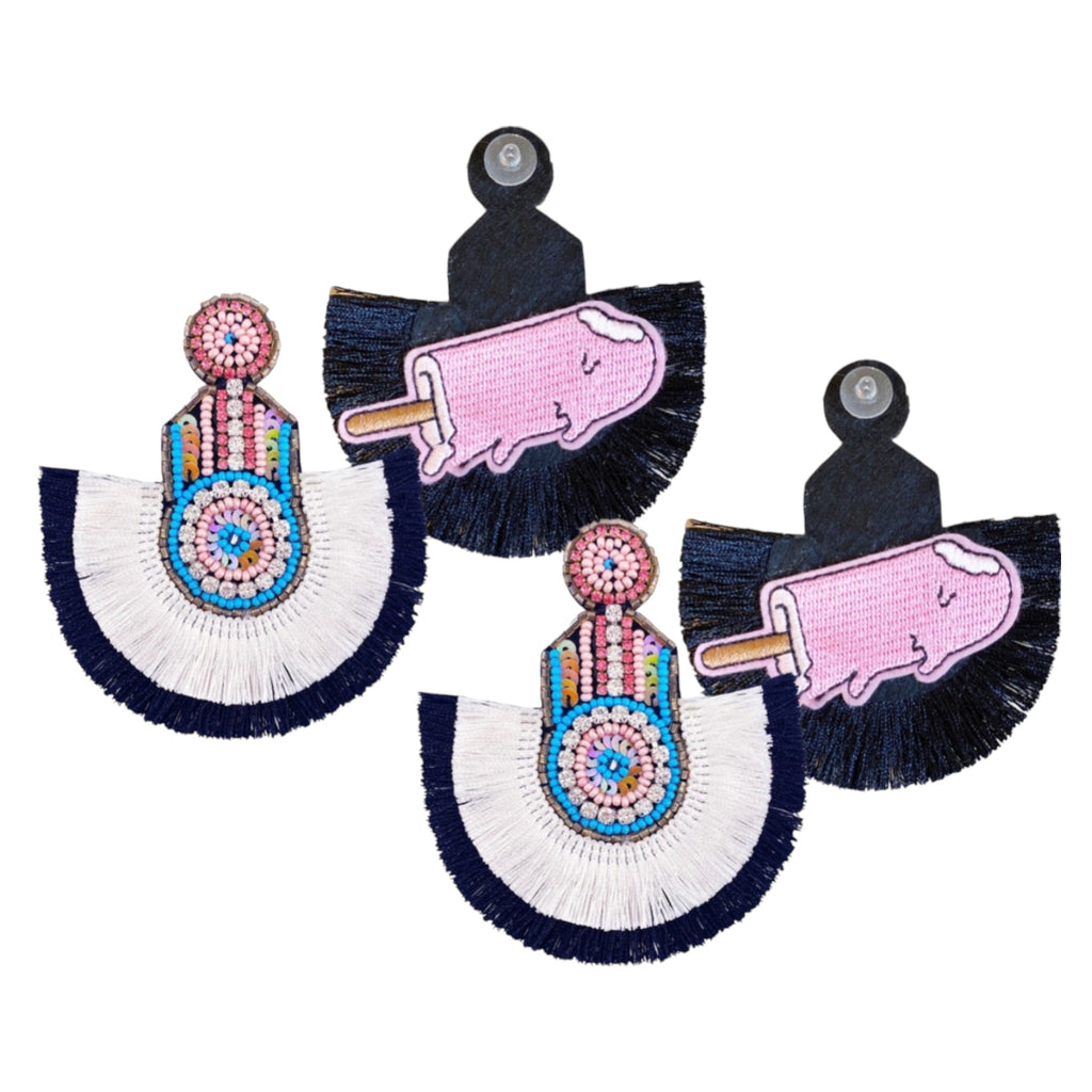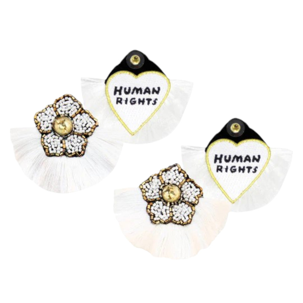 Power to the petals! These ivory flower earrings are rocking blooms, beaded centers, fringe drama, and a bold “HUMAN RIGHTS” graphic because yes, your accessories can have a voice—and these scream fabulous and fearless.