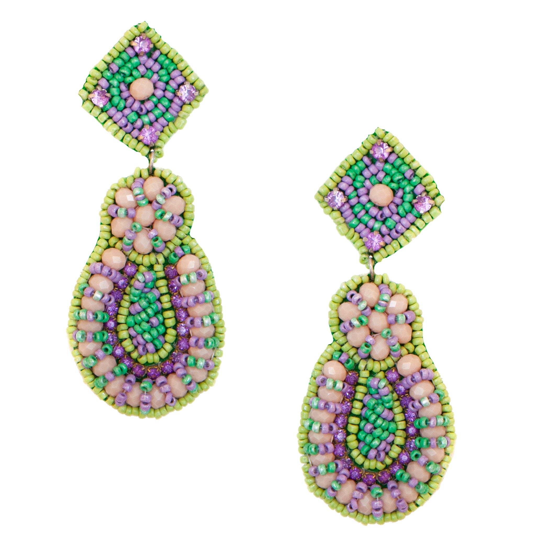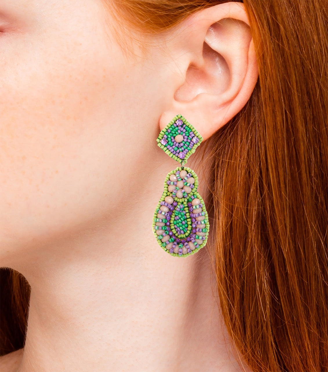 • Green Beaded Statement Earrings 🟢: Bright green fabric base with vibrant hand-beaded details in pastel pinks, purples, and blues.