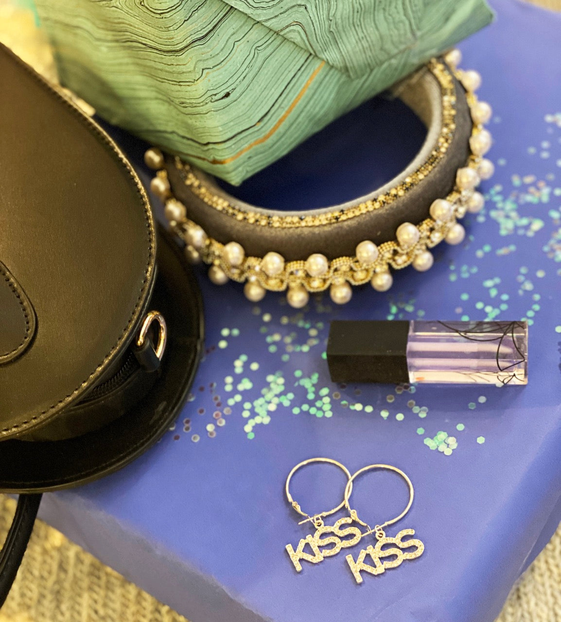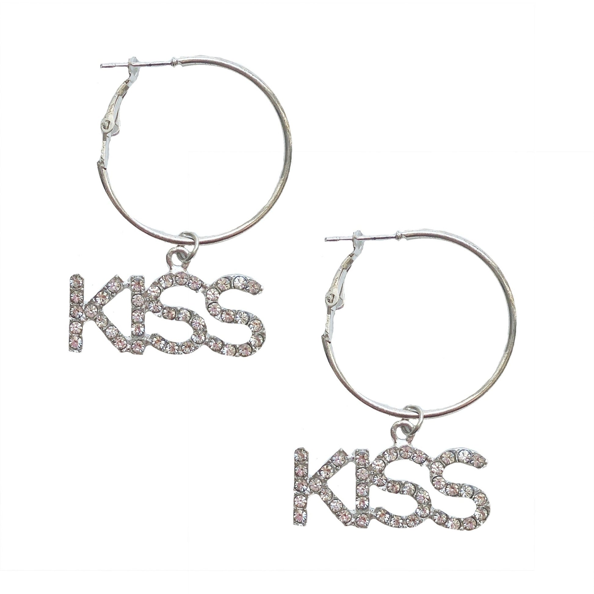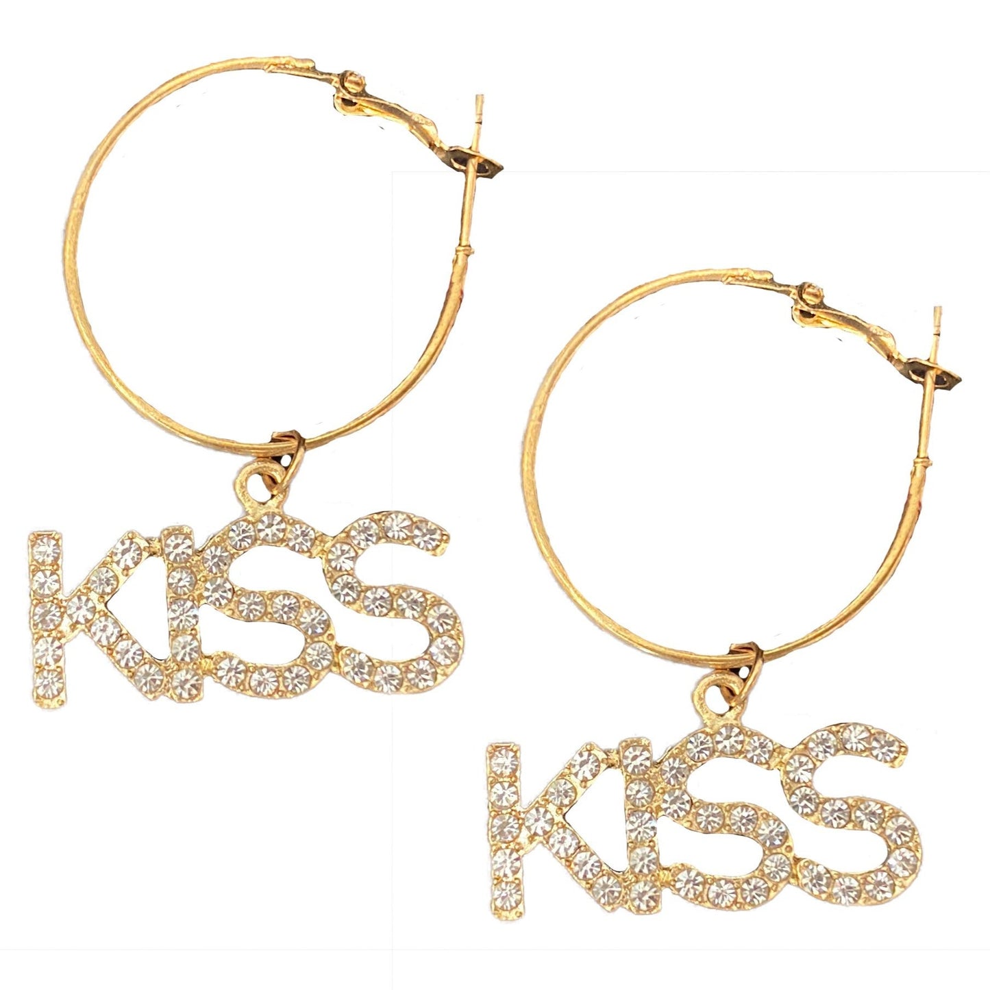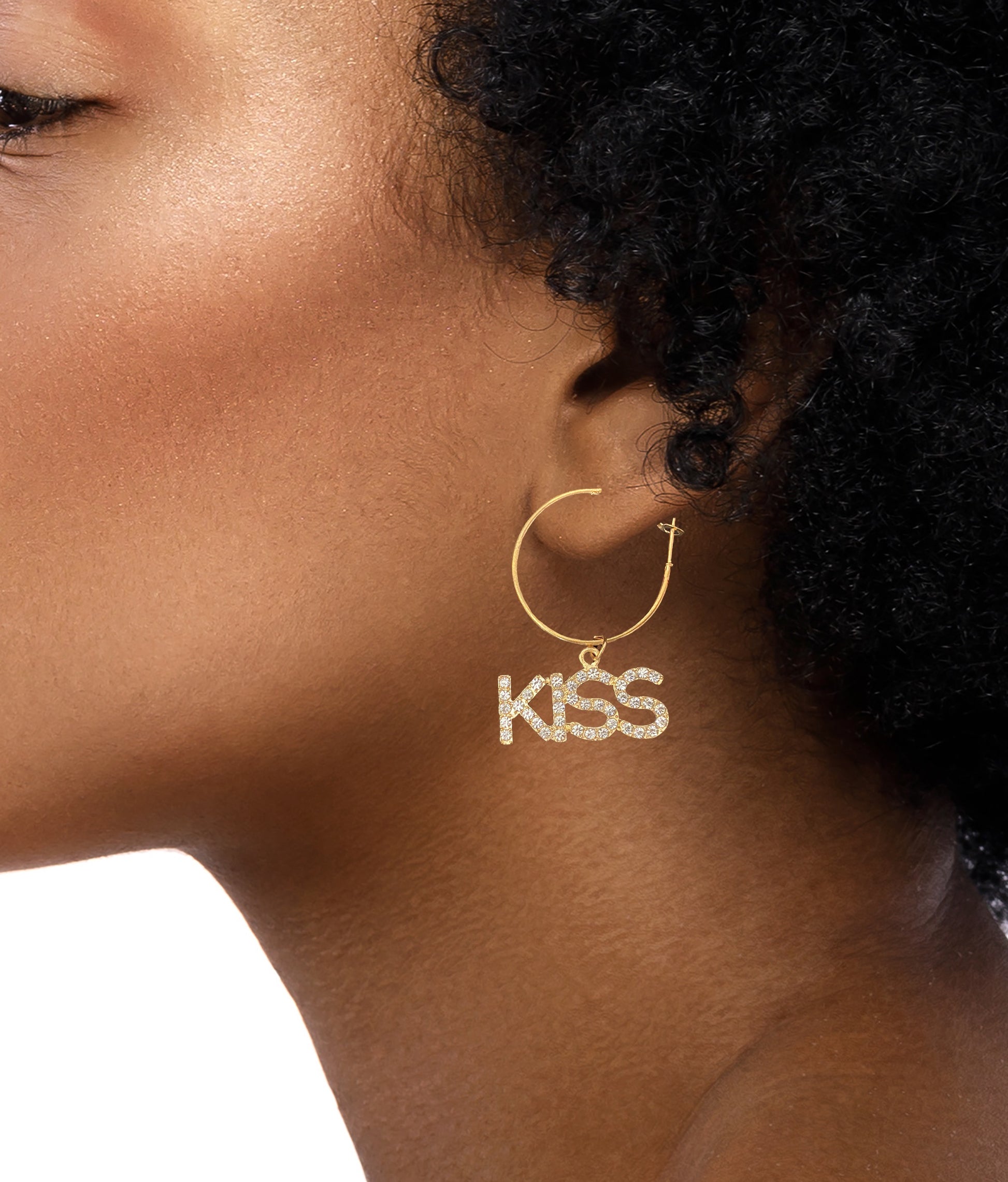• KISS Word Hoop Earrings 💋: Features dazzling crystal “KISS” charms that dangle from chic metal hoops for extra drama.