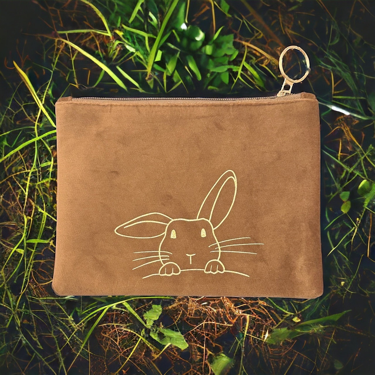 Pair this peaking bunny suede pouch with a neutral-colored outfit to let the playful design take center stage. Use it to carry your daily essentials, from your keys and phone to your lipstick and compact mirror. For a chic and sophisticated touch, accessorize with matching beige suede shoes or a wide-brimmed hat. This versatile pouch is also perfect as a unique gift for any bunny lover in your life.