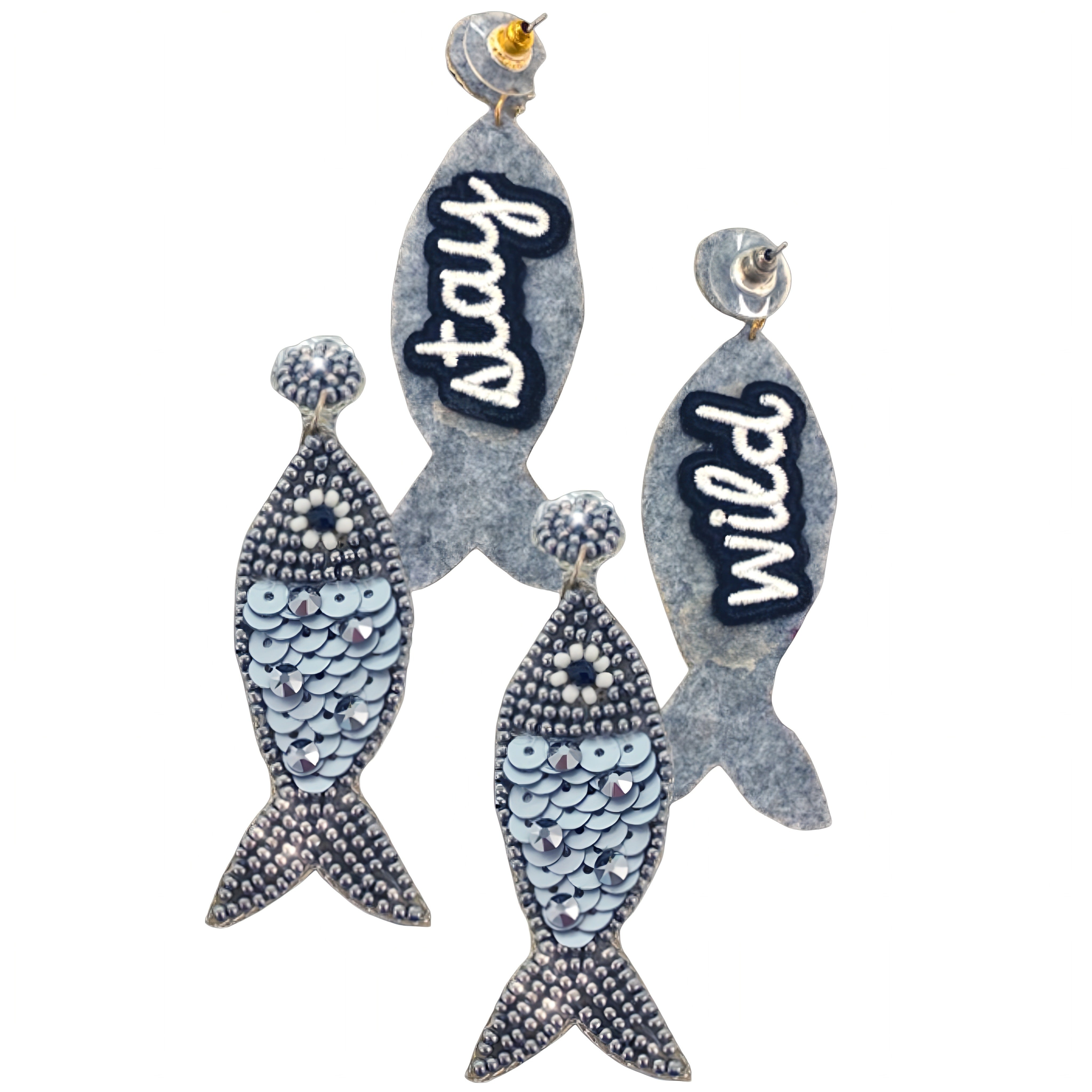 Look on the bright side with these sparkling Silver Linings Earrings, featuring dazzling silver sequins in a fun fish design! Perfect for adding a touch of glitz and glam to any outfit, these playful earrings are sure to bring you good luck. With "Stay Wild" and "Wild" patches, they make a bold statement wherever you go.