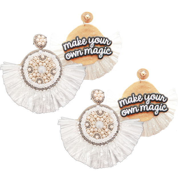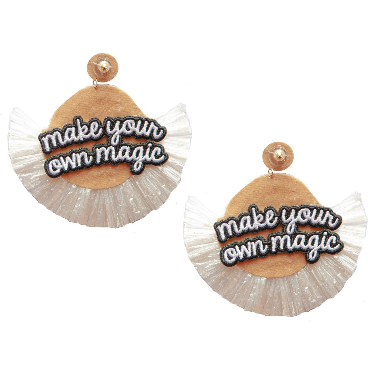 Pair these Weekend Getaway Earrings with a simple dress or casual outfit to add a touch of modern elegance. The bold geometric design and "Make Your Own Magic" patch make them versatile enough to complement both daytime and evening looks.