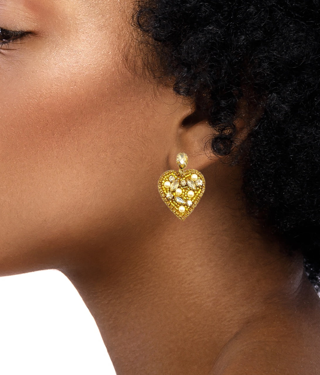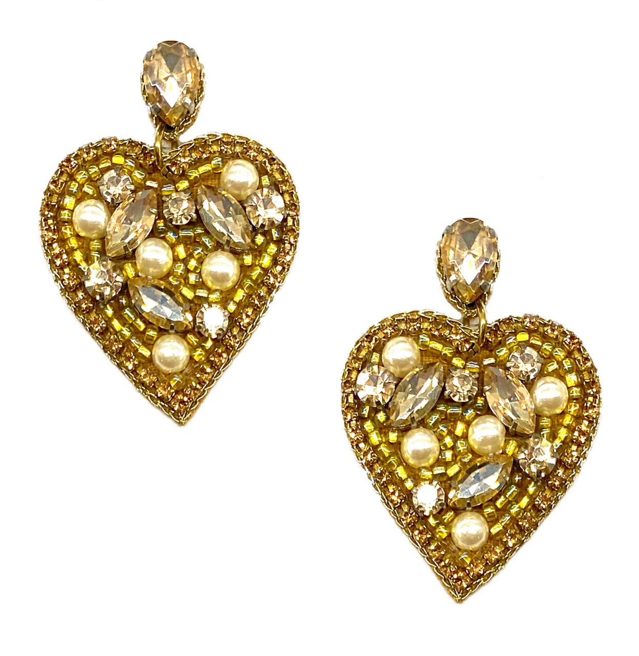 Pair the Heart of Gold Earrings with a classic little black dress or a chic blouse and trousers for a sophisticated look. The luminous stones and metallic finish make these earrings versatile enough to complement both casual and formal attire, adding a touch of elegance wherever you go.