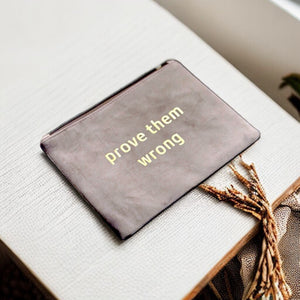 Embrace the spirit of empowerment with our Prove Them Wrong Suede Pouch. Crafted from 100% vegan suede, this sustainable accessory is a testament to ethical and cruelty-free fashion. Its embroidered slogan, "Prove Them Wrong," serves as a reminder to believe in yourself and defy expectations. The soft and supple texture of the vegan suede adds a touch of sophistication to any outfit, making it a versatile piece for both casual and formal occasions.