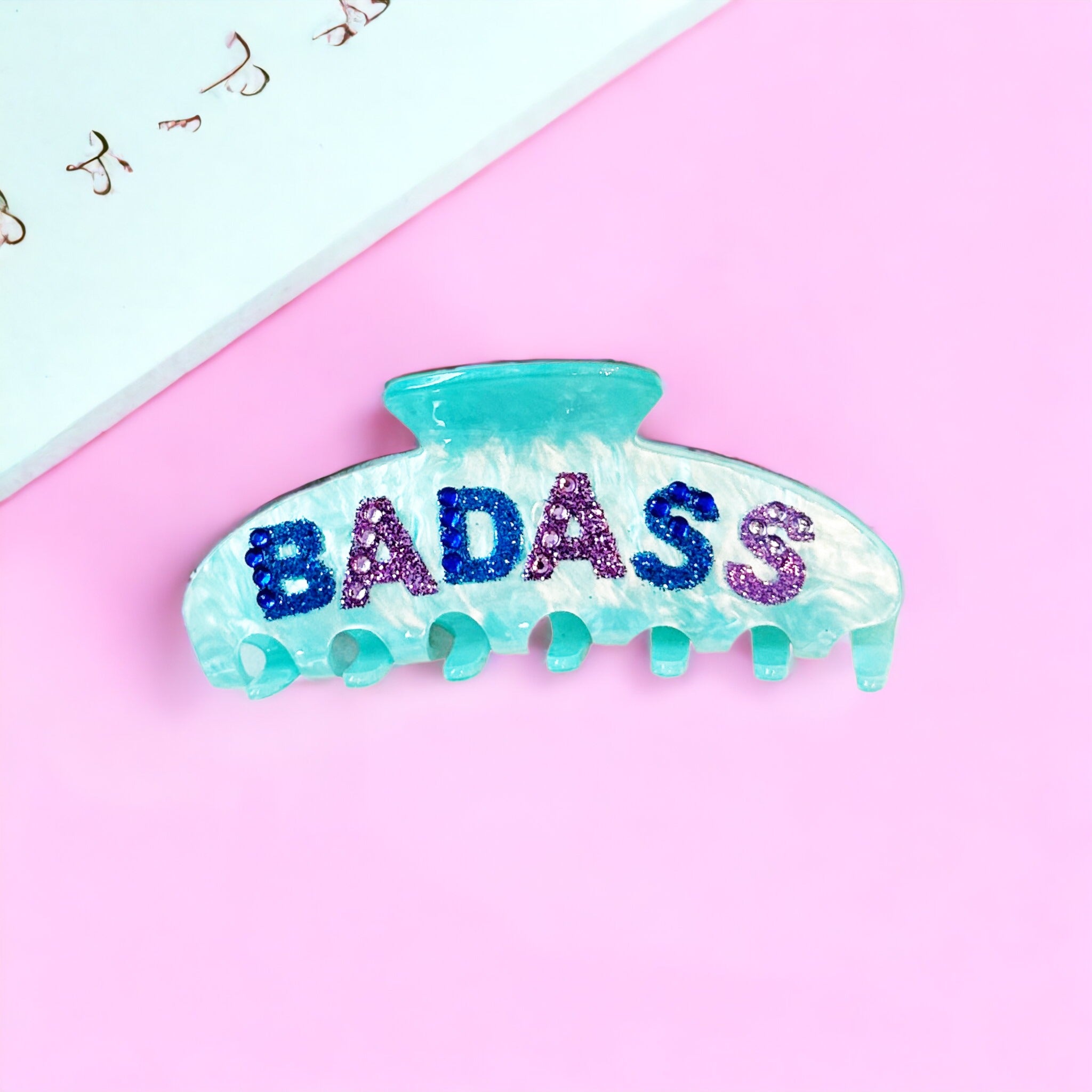 • 💎 Bold Rhinestone Lettering: The word "BADASS" is prominently displayed in shimmering blue and purple rhinestones, making this hair clip a statement piece that demands attention.