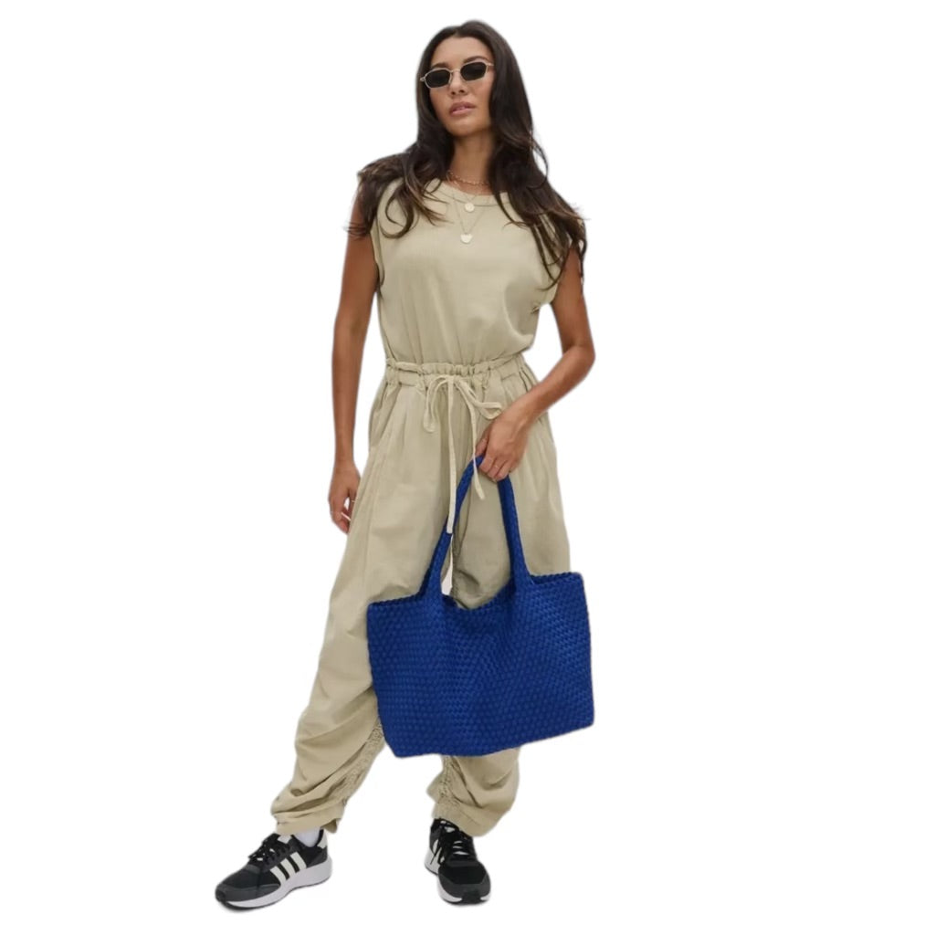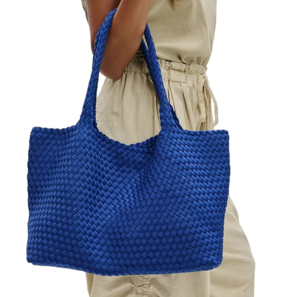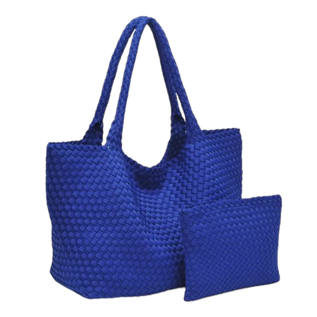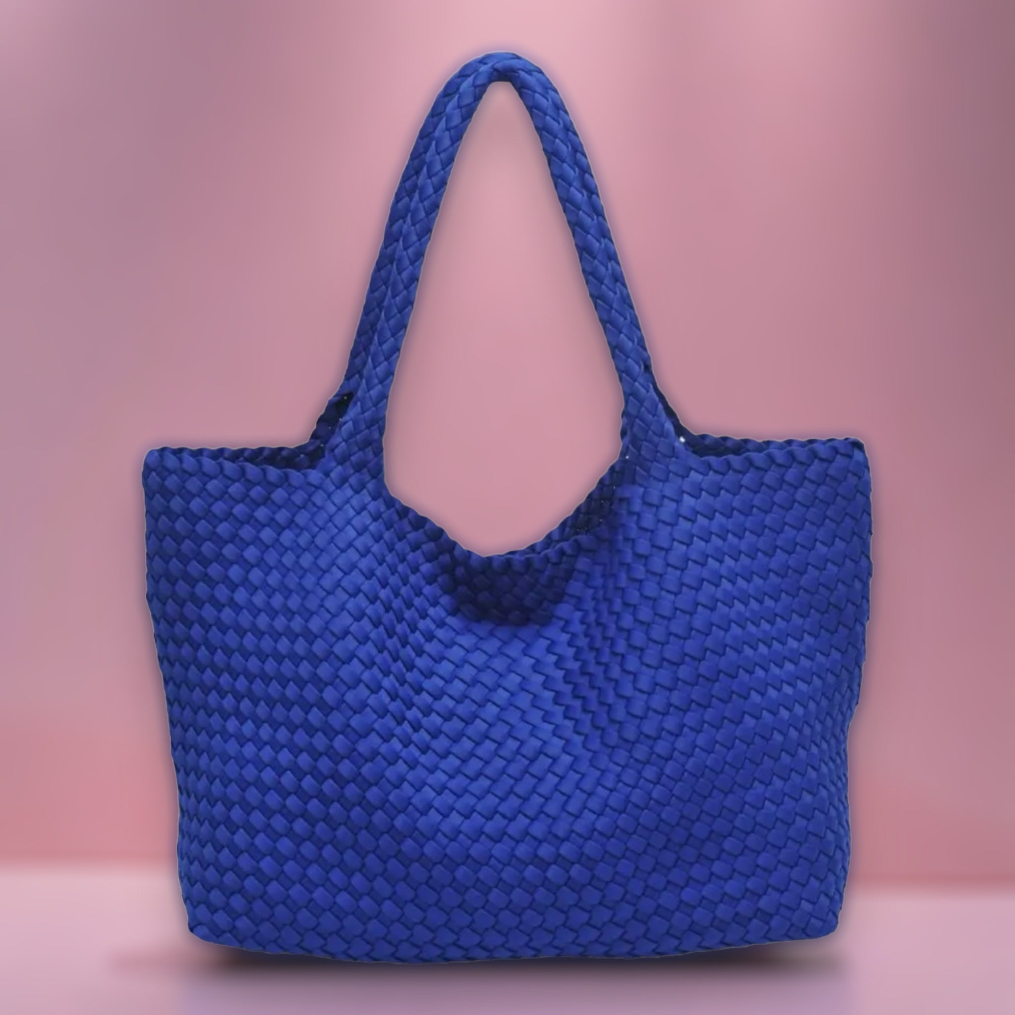 Pair the Basketweave Blue Tote with your favorite summer dress or a casual beach outfit. Whether you're headed to a picnic or a day at the shore, this tote adds a vibrant and stylish touch to your look. Its roomy interior means you can carry all your essentials with ease, making it both fashionable and functional.