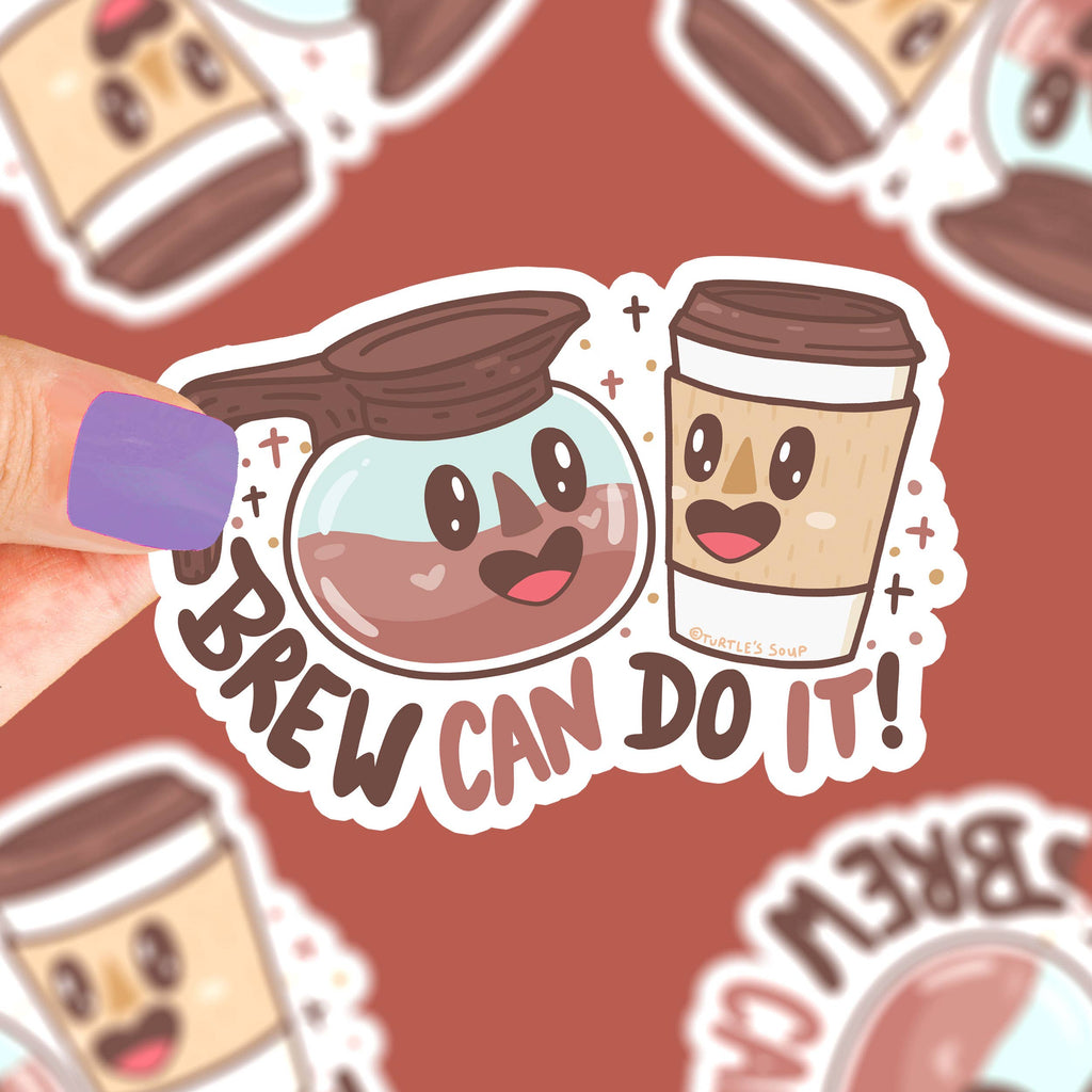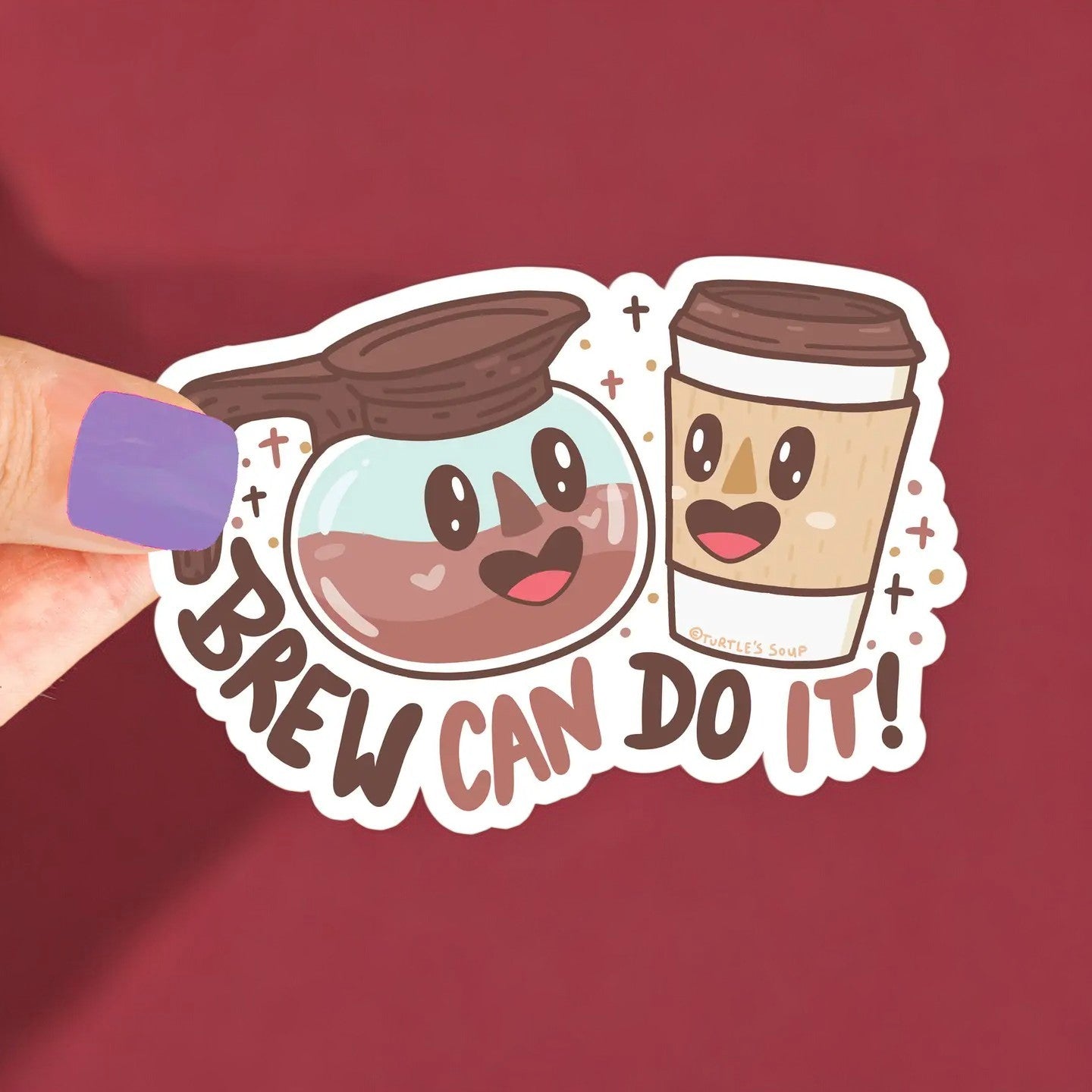 This adorable "Brew Can Do It!" sticker features a whimsical design of happy coffee characters. Perfect for personalizing laptops, water bottles, or planners, this cute sticker adds a delightful touch to your accessories. It's an ideal gift for coffee lovers and a great way to express your fun personality.