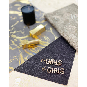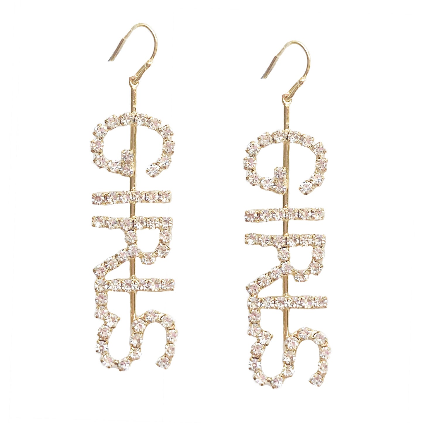 • Crystal GIRLS Statement Earrings 💎: Rhinestone-studded letters cascade vertically, spelling GIRLS with unapologetic sparkle.
