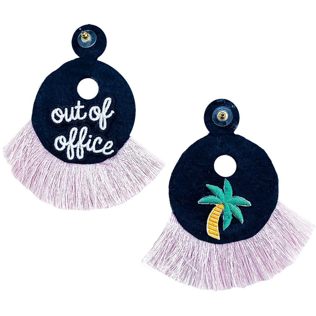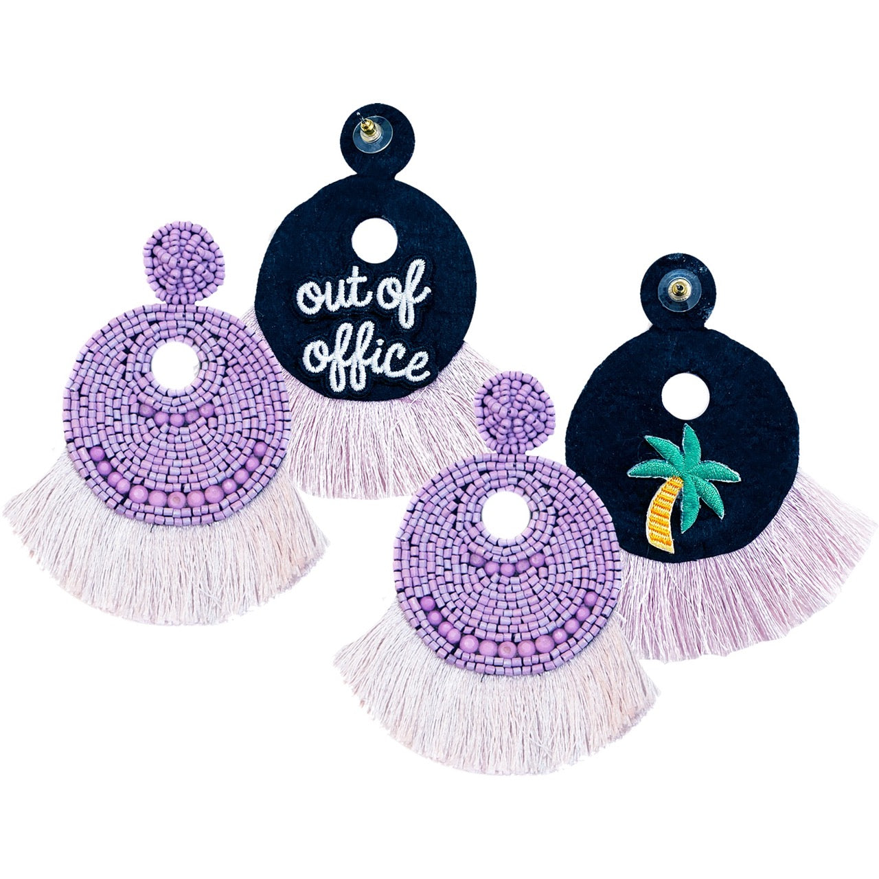 Bring the vacation vibes to your everyday life with our "Fringe Benefits Lilac Earrings." These playful statement earrings feature lilac beading with a fringe detail, along with fun "Out of Office" and palm tree patches. Lightweight and full of charm, these earrings are perfect for channeling sunny, out-of-office energy, no matter where you are.