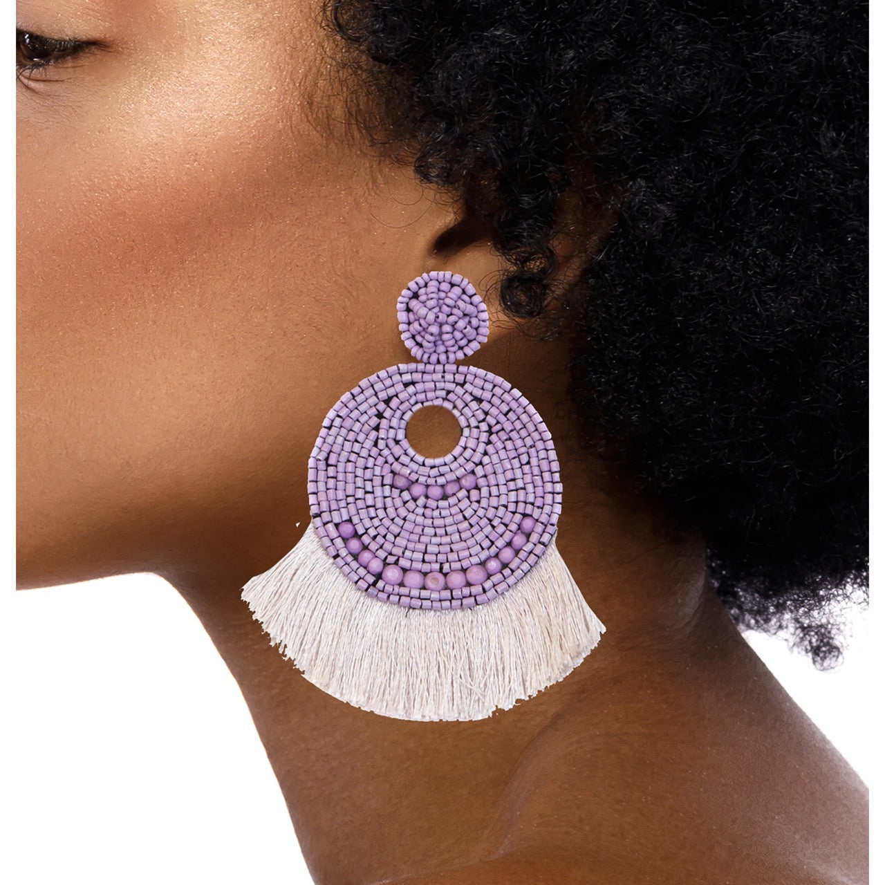 Pair these "Fringe Benefits Lilac Earrings" with a breezy sundress or a simple blouse and shorts to bring out their tropical charm. Their lilac color and playful patches make them perfect for adding a touch of fun to any summer outfit, whether you're headed to the beach or just dreaming of it.