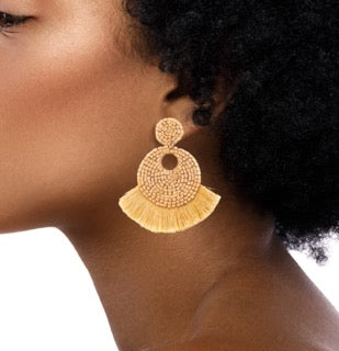 Pair the Fringe Benefits Petit Camel Earrings with a white summer dress or your favorite boho-inspired outfit. The camel color complements earthy tones, making these earrings versatile for both casual and dressy occasions.
