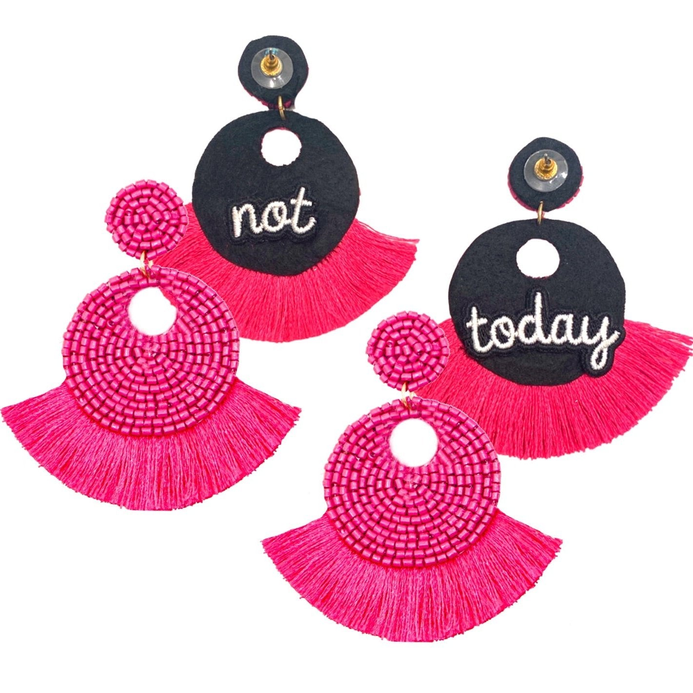 Add a burst of color to your look with our Fringe Benefits Petit Fuchsia Earrings. These vibrant earrings are beaded with love and feature a bold fringe that makes a statement. Whether you're dressing up or down, these earrings are perfect for adding a playful touch of pink to your outfit. The "Not Today" patch adds a fun and sassy element, making these earrings both stylish and expressive.