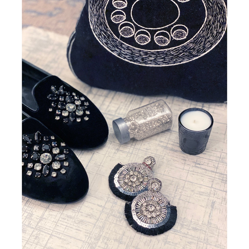 Elevate your glam game with the Good to Glow Silver Earrings. These statement earrings feature intricate silver beadwork adorned with sparkling stones, complemented by a classy black fringe around the base. The playful "UGH" patch adds a touch of attitude, making these earrings perfect for those who love to mix elegance with a bit of fun.