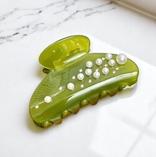 This stunning green hair clip features beautiful pearl embellishments, perfect for adding a touch of elegance to any hairstyle. Crafted from high-quality materials, this claw clip not only holds your hair securely but also enhances your look effortlessly. Whether for casual outings or special events, this fashionable hair accessory is essential for every modern woman's collection.