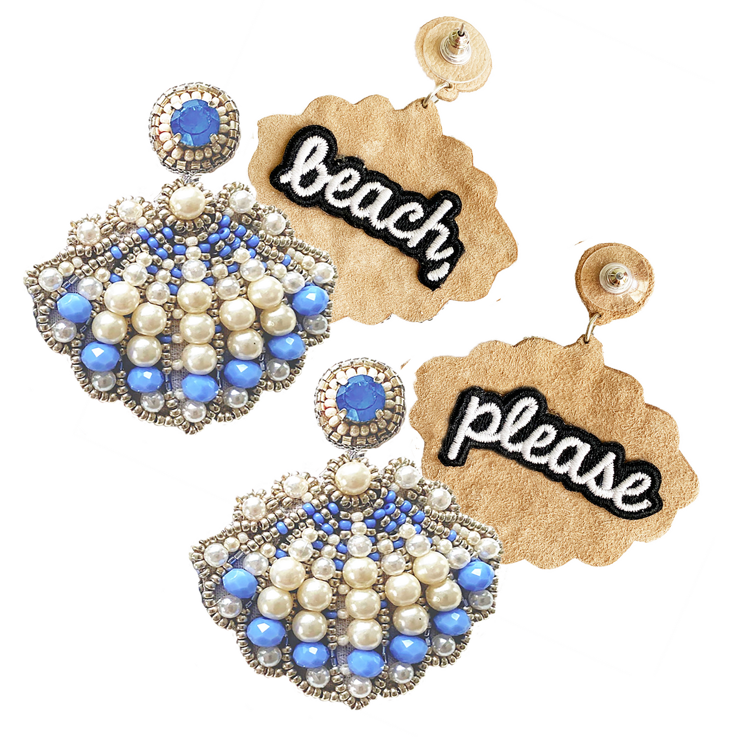 Turn heads with these Pearl Beaded Shell Earrings, a perfect blend of coastal vibes and statement style. Featuring intricate blue and white beading, pearl accents, and a playful "Beach, Please" patch design, these lightweight earrings are hypoallergenic and handcrafted for all-day wear. A must-have for your summer wardrobe!