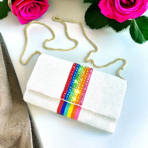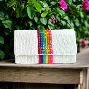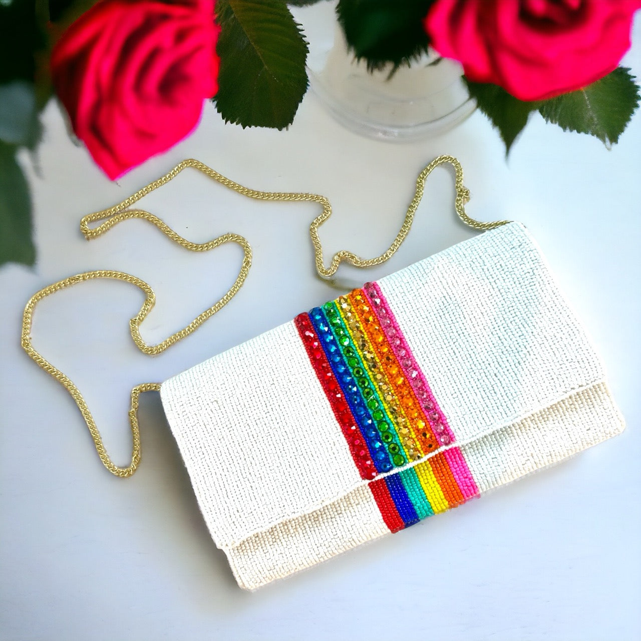 Indulge in the vibrant charm of our exquisite rainbow beaded bag, a captivating accessory that will make a statement wherever you go. Crafted with meticulous attention to detail, this bag features an array of shimmering beads arranged in a captivating rainbow design. Its compact size and adjustable crossbody strap make it perfect for both day and evening events. The vibrant hues and intricate beadwork will elevate any outfit, adding a touch of playful glamour to your look.