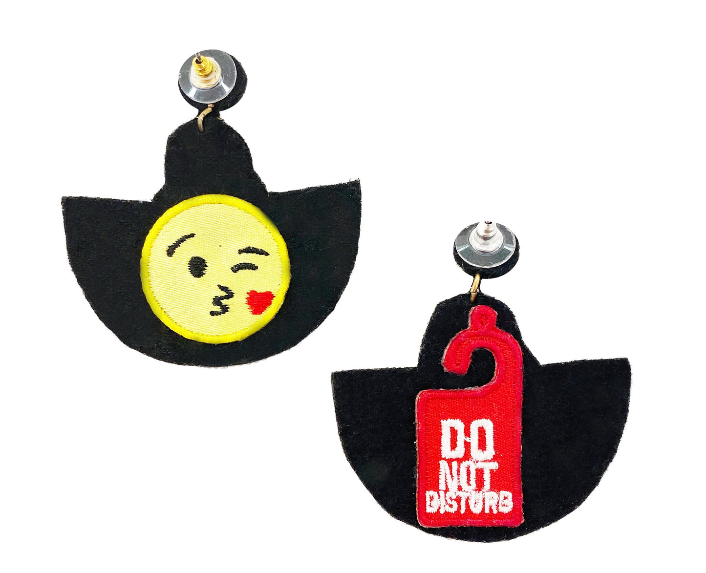 • 😍 Kiss Emoji Patch Design: Features a fun and trendy blowing kiss emoji paired with a bold 'Do Not Disturb' patch, making these earrings both playful and stylish.