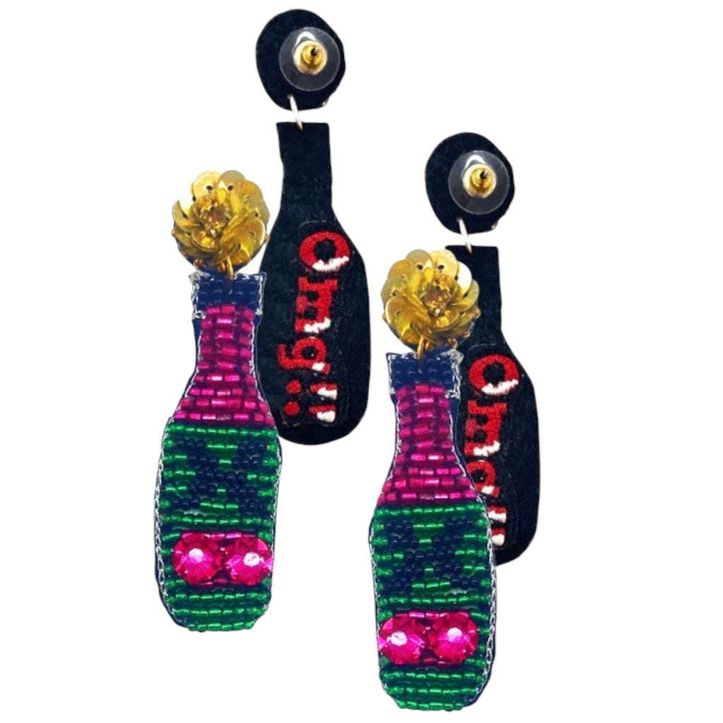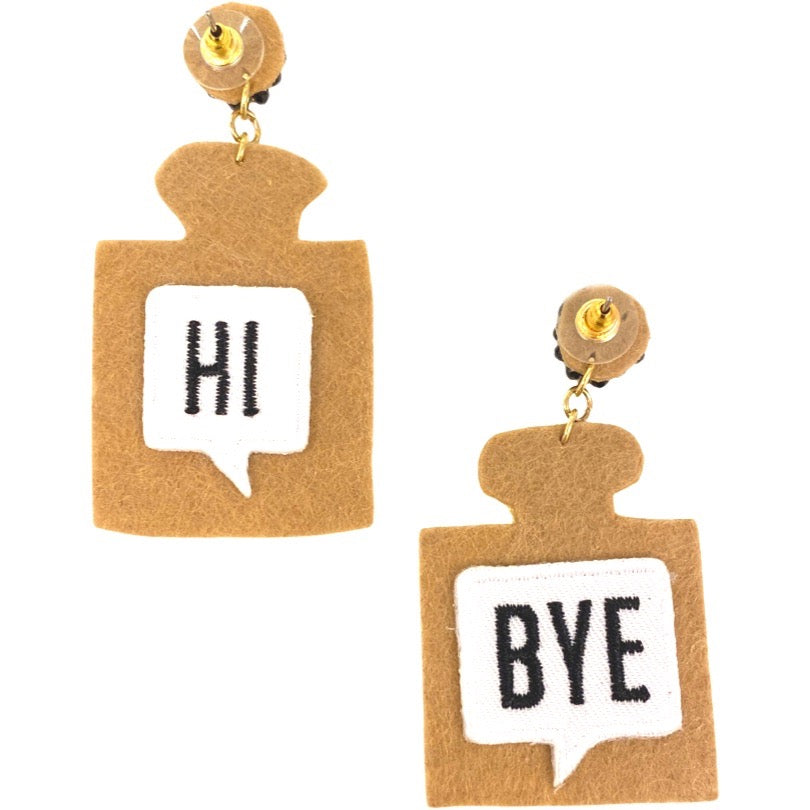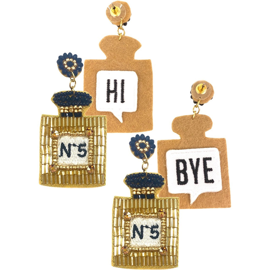 Add a touch of fun and elegance with the Makes Scents "Hi Bye" Perfume Bottle Earrings. These playful statement earrings feature embroidered perfume bottles with "Hi" and "Bye" speech bubbles, making them a quirky yet chic addition to any outfit. Perfect for those who love to stand out, these earrings are both unique and stylish.