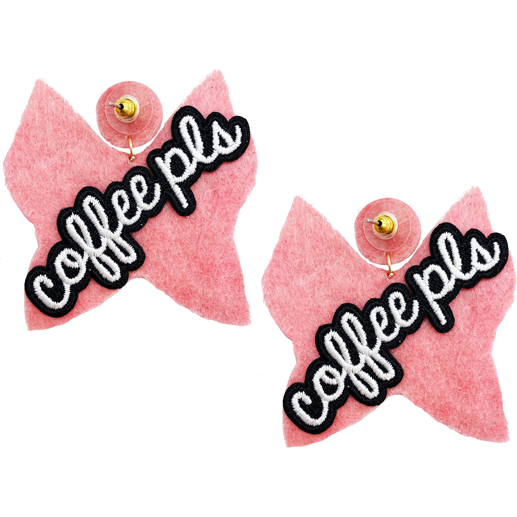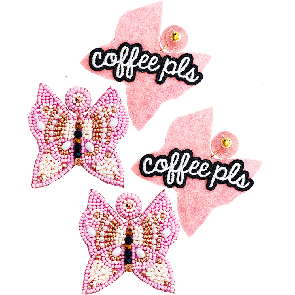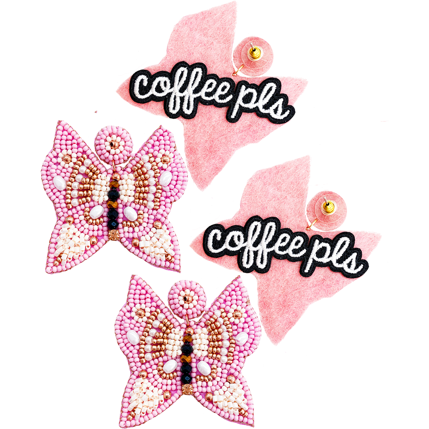 Turn heads and perk up conversations with these lightweight, blush-pink Blushing Butterfly Earrings. Featuring crystal embellishments and a quirky "Coffee pls" patch design, these earrings are your perfect match for coffee dates, brunches, or anywhere you want to sparkle. At just 6 grams (as light as a Hershey's Kiss!), these trendy handmade beauties are a unique addition to any accessory collection.