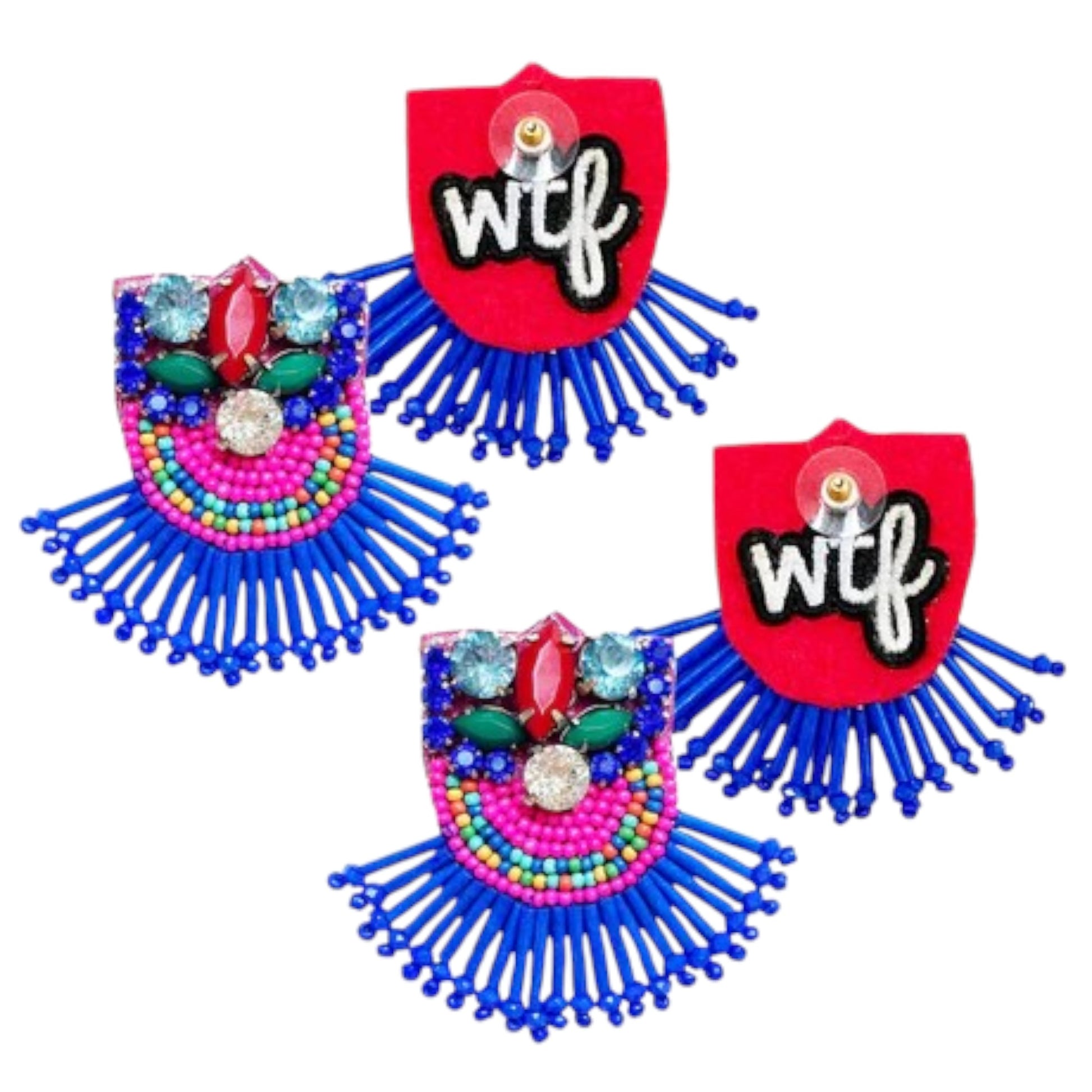 • Unique Design: The Confetti Earrings feature a striking mix of pink and blue tones with a playful "WTF" patch.
