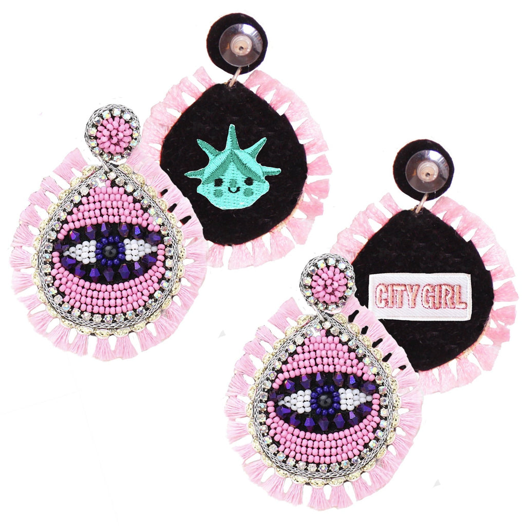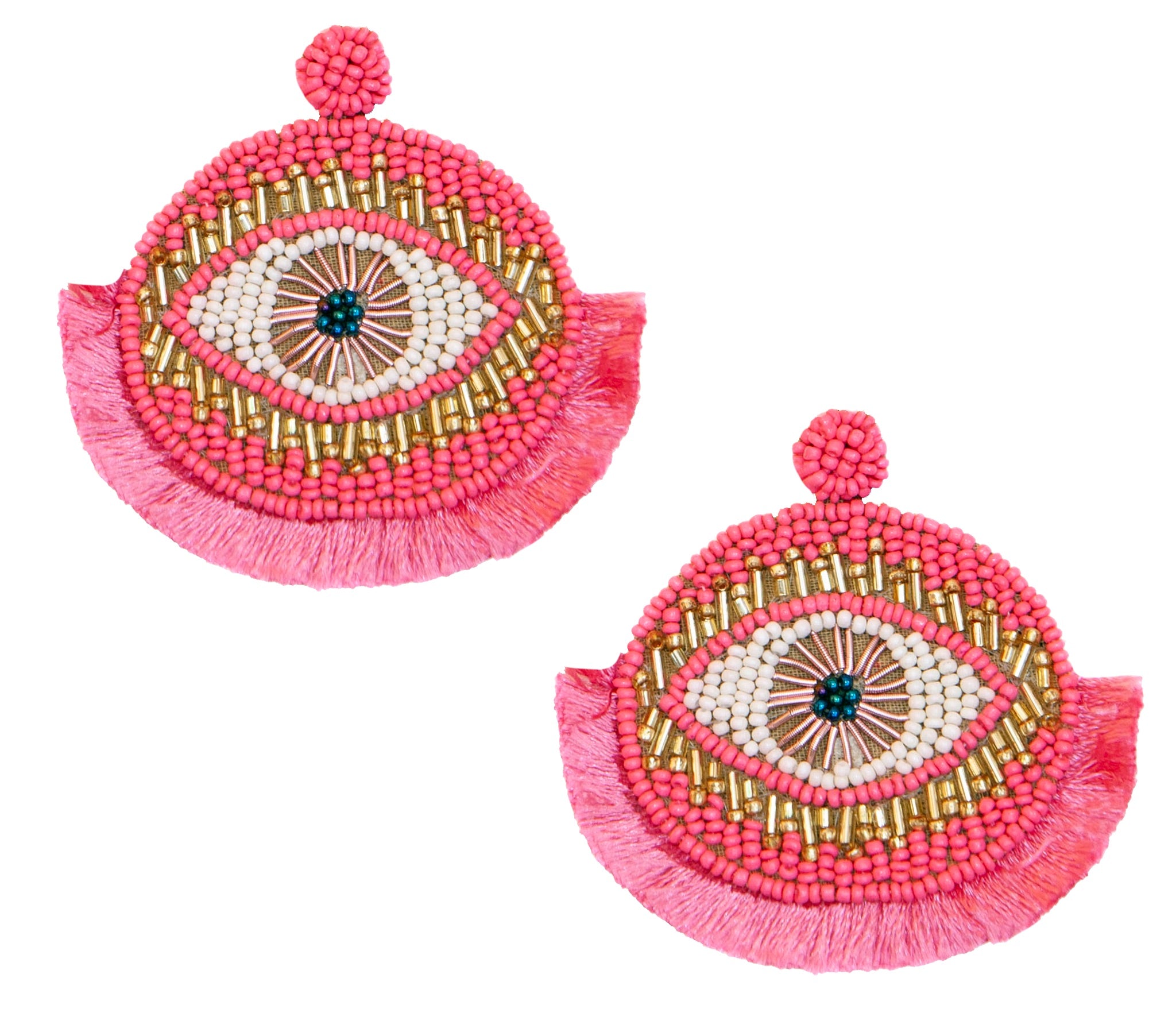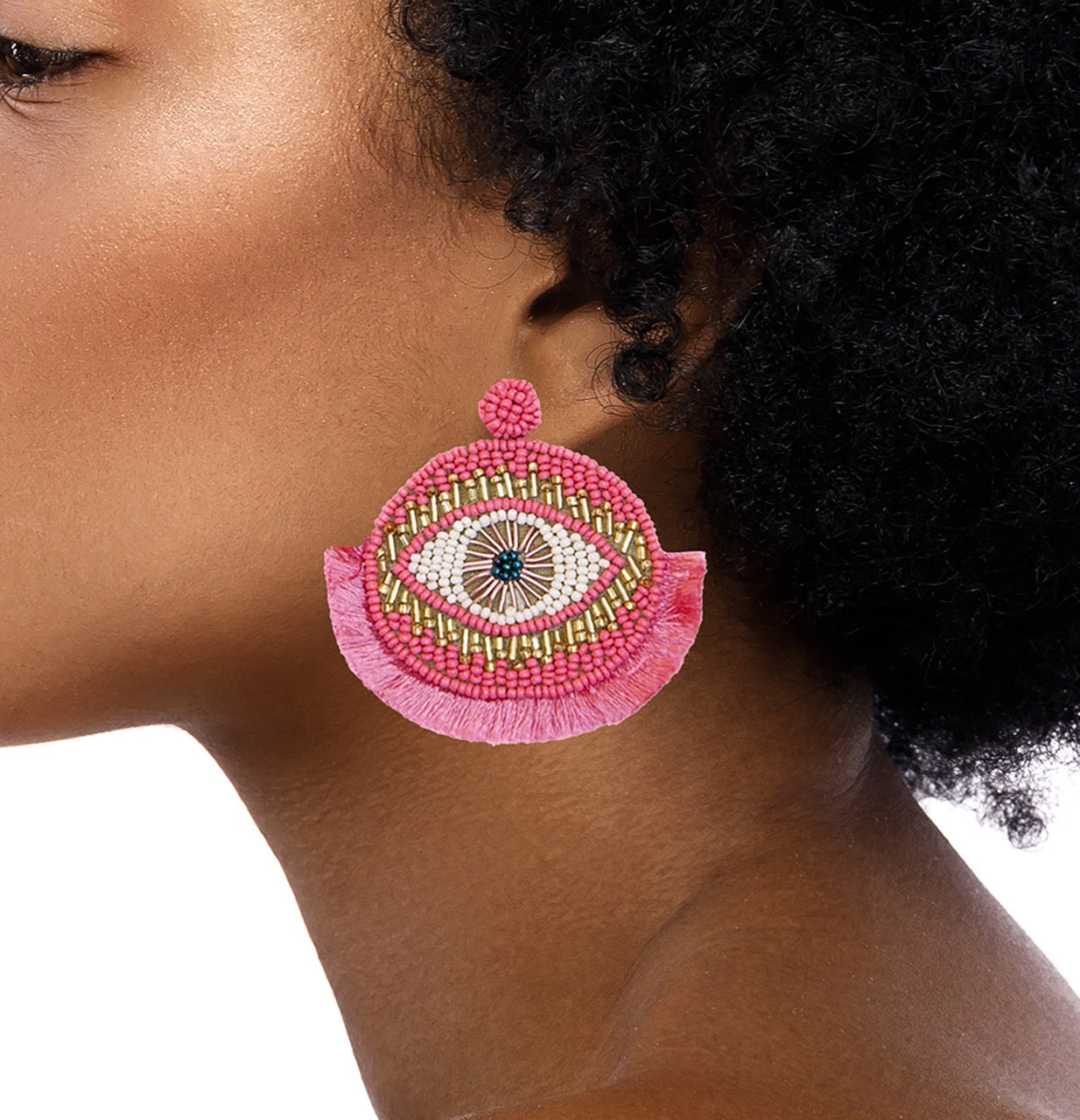 Our Eye Catcher Pink Earrings combine the classic evil eye design with short, lush fringes at the base and intricate beading for the ultimate, mysterious radiance. Catch your breath with this collection as it comes in a broad range of colors so there’s an earring for protection with any outfit you love.