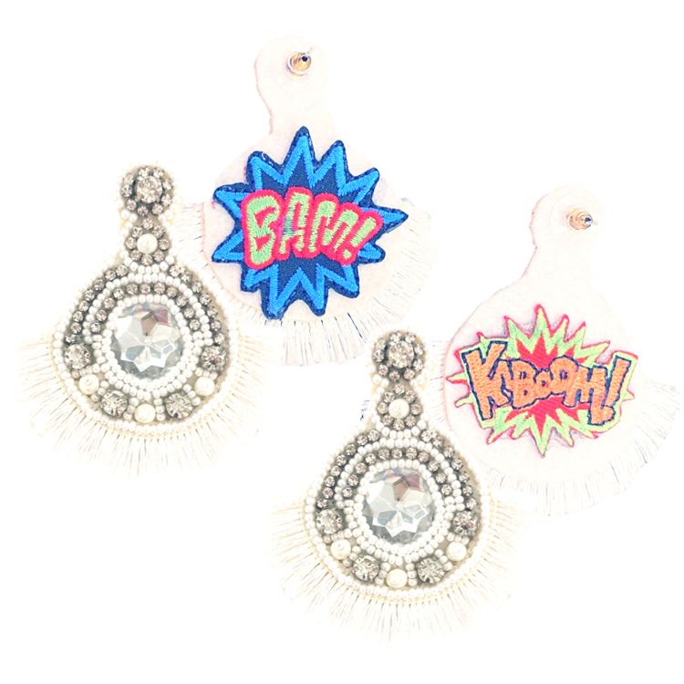 • 🎇 Space-Themed Design: The unique space-inspired design with Bam! Kaboom! patches adds a playful yet glamorous vibe, making these earrings stand out.