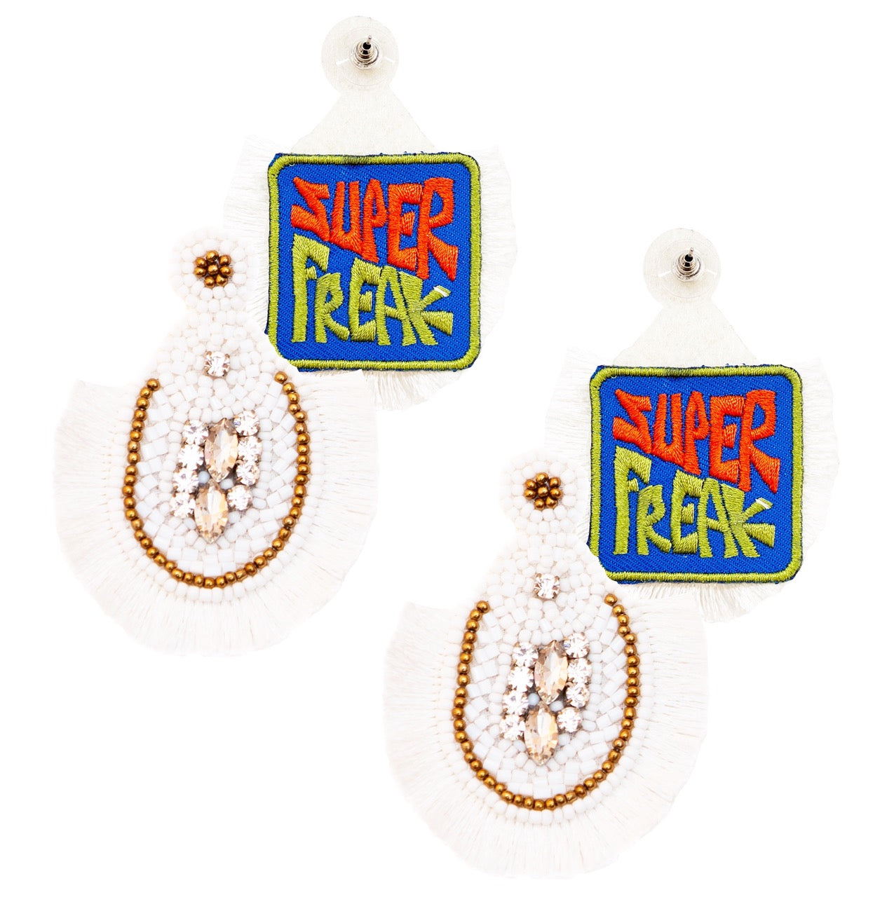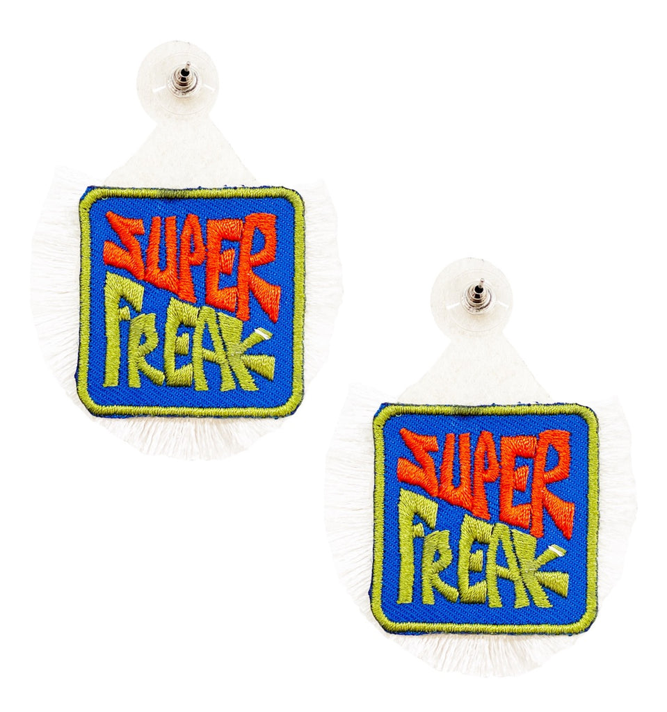 • Versatile and Bold: The "Super Freak" patch adds a bold and fun element, making these earrings perfect for both casual and dressy outfits.