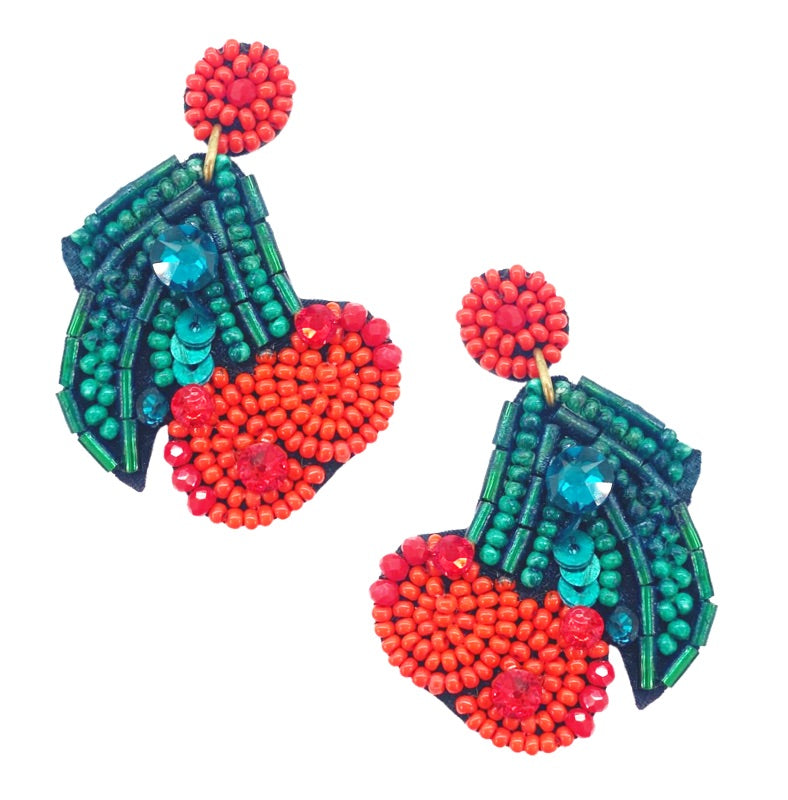Playful Cherry Design: 🍒 Featuring a whimsical cherry design with ornate seed beads, these earrings add a touch of fun and color.