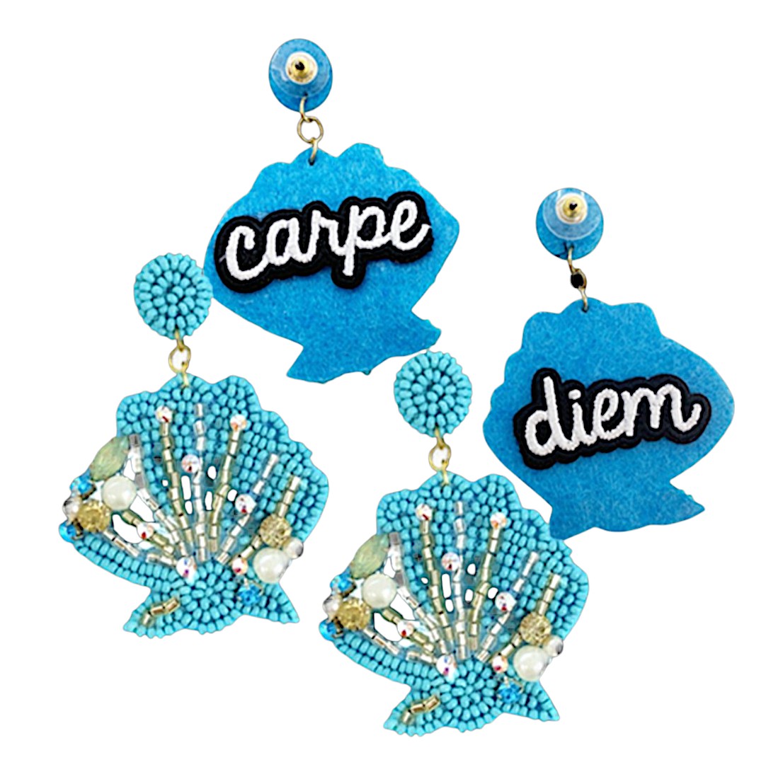 Embrace the ocean’s beauty with the Shell Seeker Aqua Earrings. These unique earrings feature intricately beaded shells in a stunning aqua hue, paired with bold “Carpe Diem” patches, inspiring you to seize the day in style. Perfect for beach lovers and those who cherish nautical fashion, these earrings add a vibrant touch to any outfit.