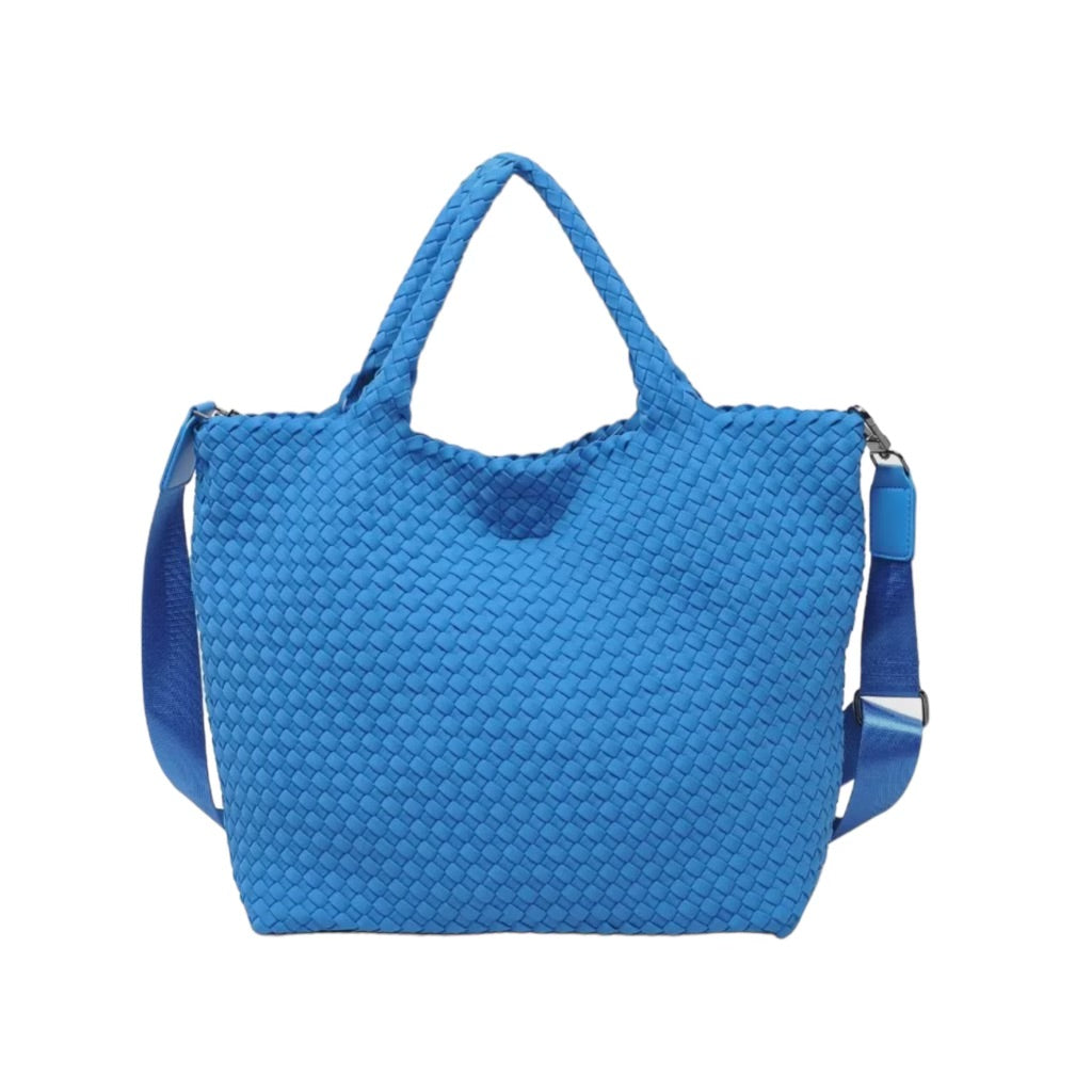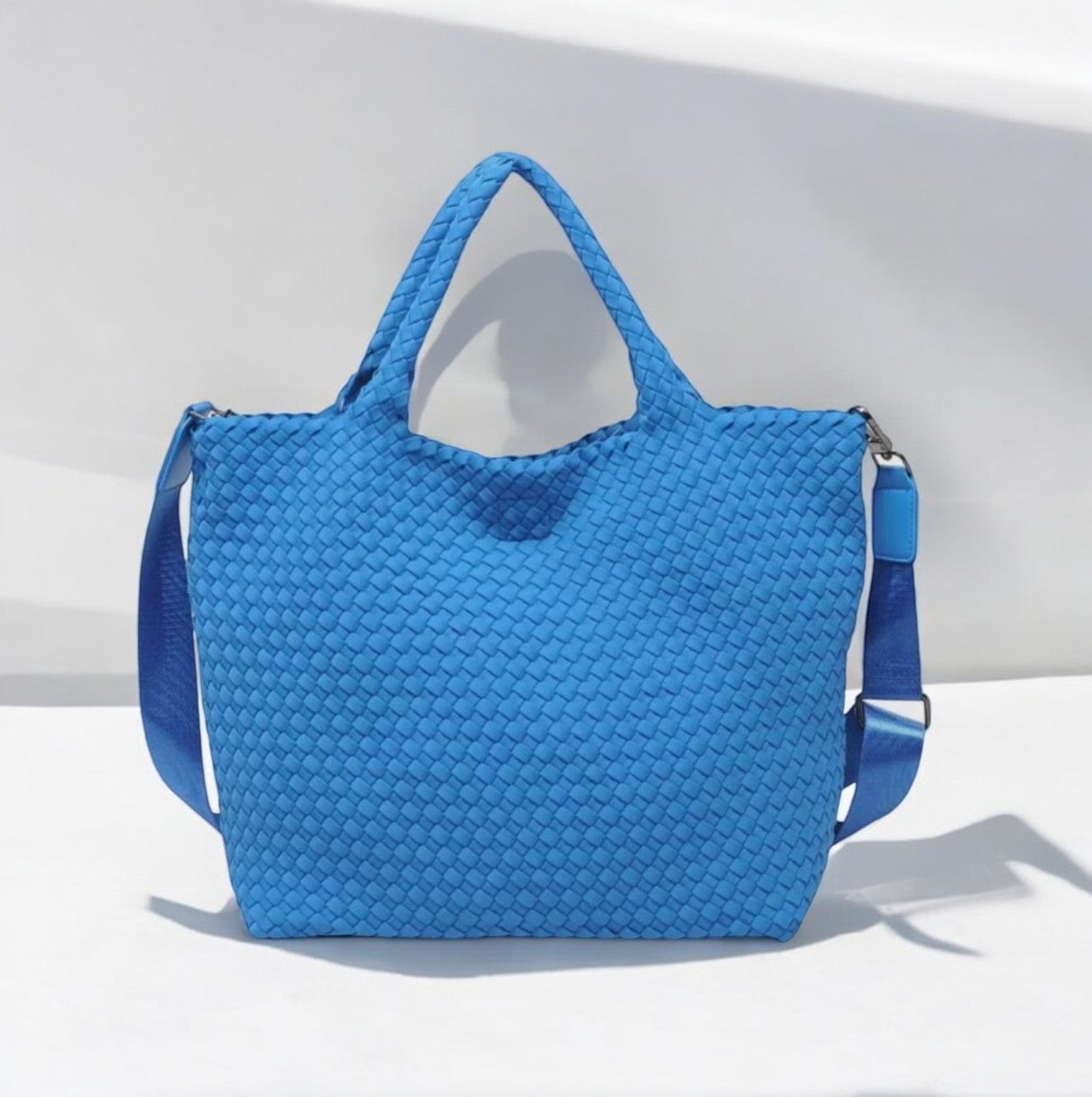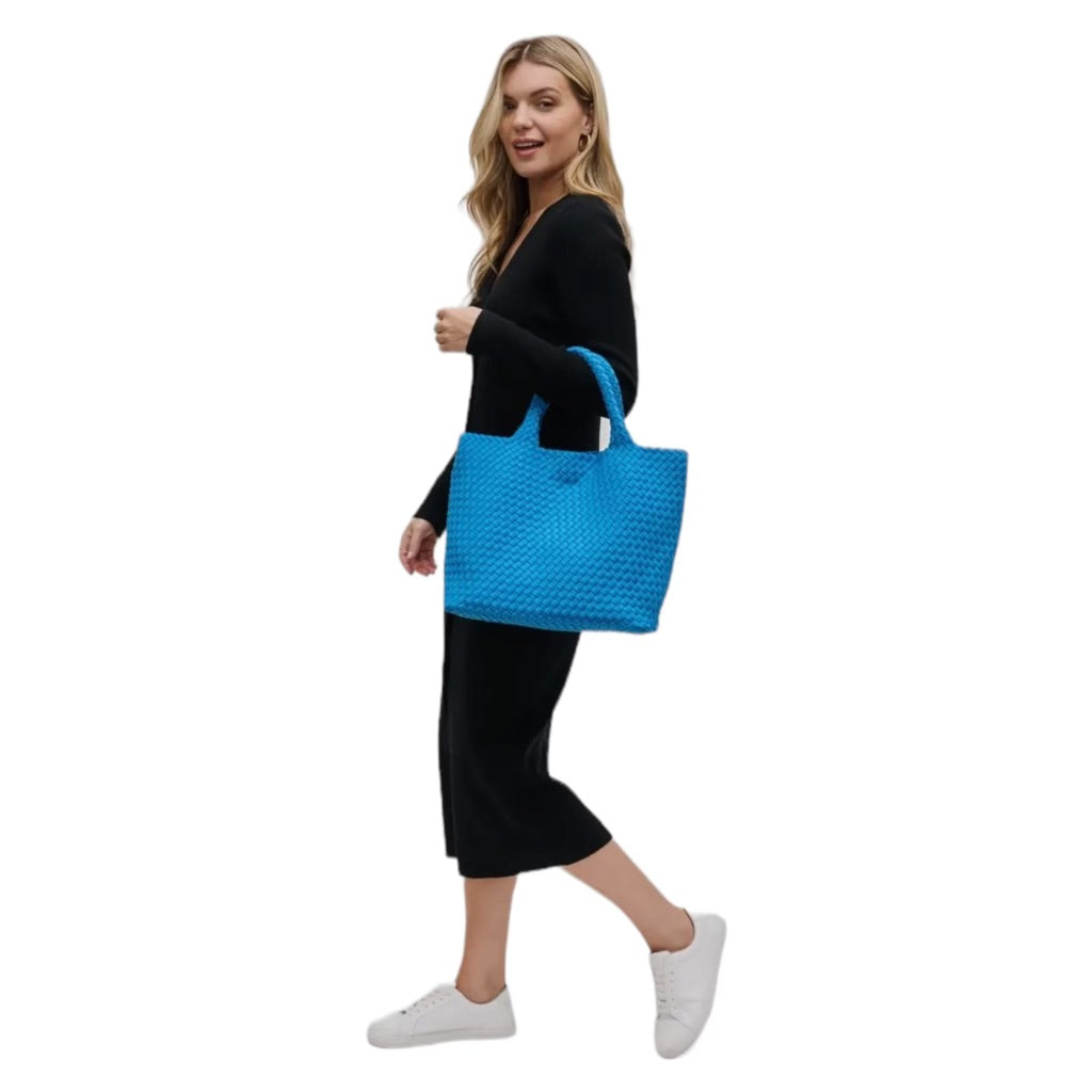 Carry your essentials in style with the Basketweave Aqua Tote! This vibrant bag, crafted from durable neoprene, features a unique basketweave design that adds a playful touch to any outfit. Spacious and lightweight, it’s the perfect companion for a day at the beach or a casual picnic. With ample room for your belongings, this tote combines fashion and function effortlessly.