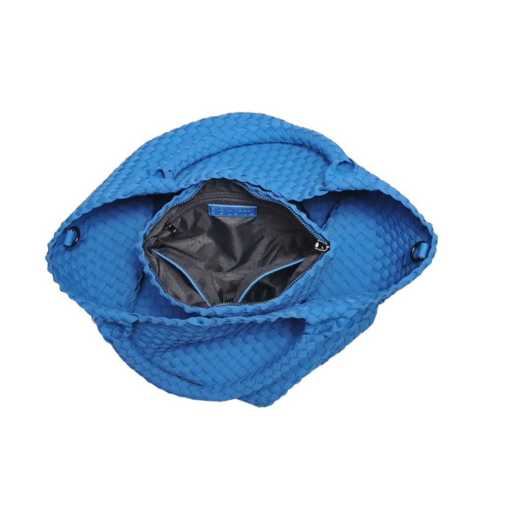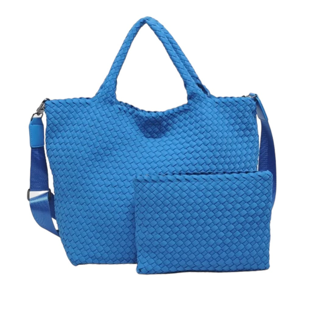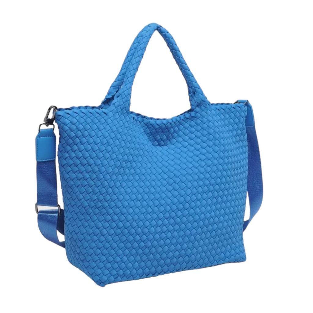 Carry your essentials in style with the Basketweave Aqua Tote! This vibrant bag, crafted from durable neoprene, features a unique basketweave design that adds a playful touch to any outfit. Spacious and lightweight, it’s the perfect companion for a day at the beach or a casual picnic. With ample room for your belongings, this tote combines fashion and function effortlessly.
