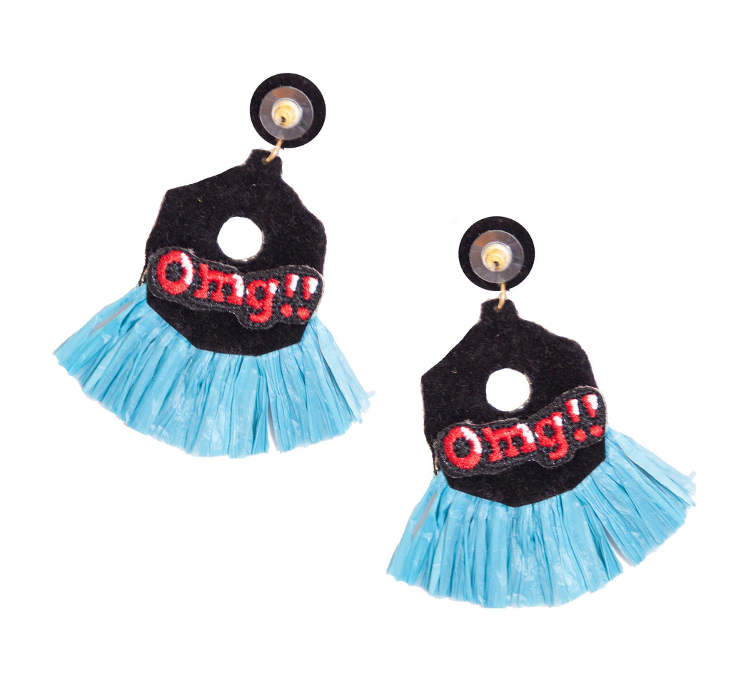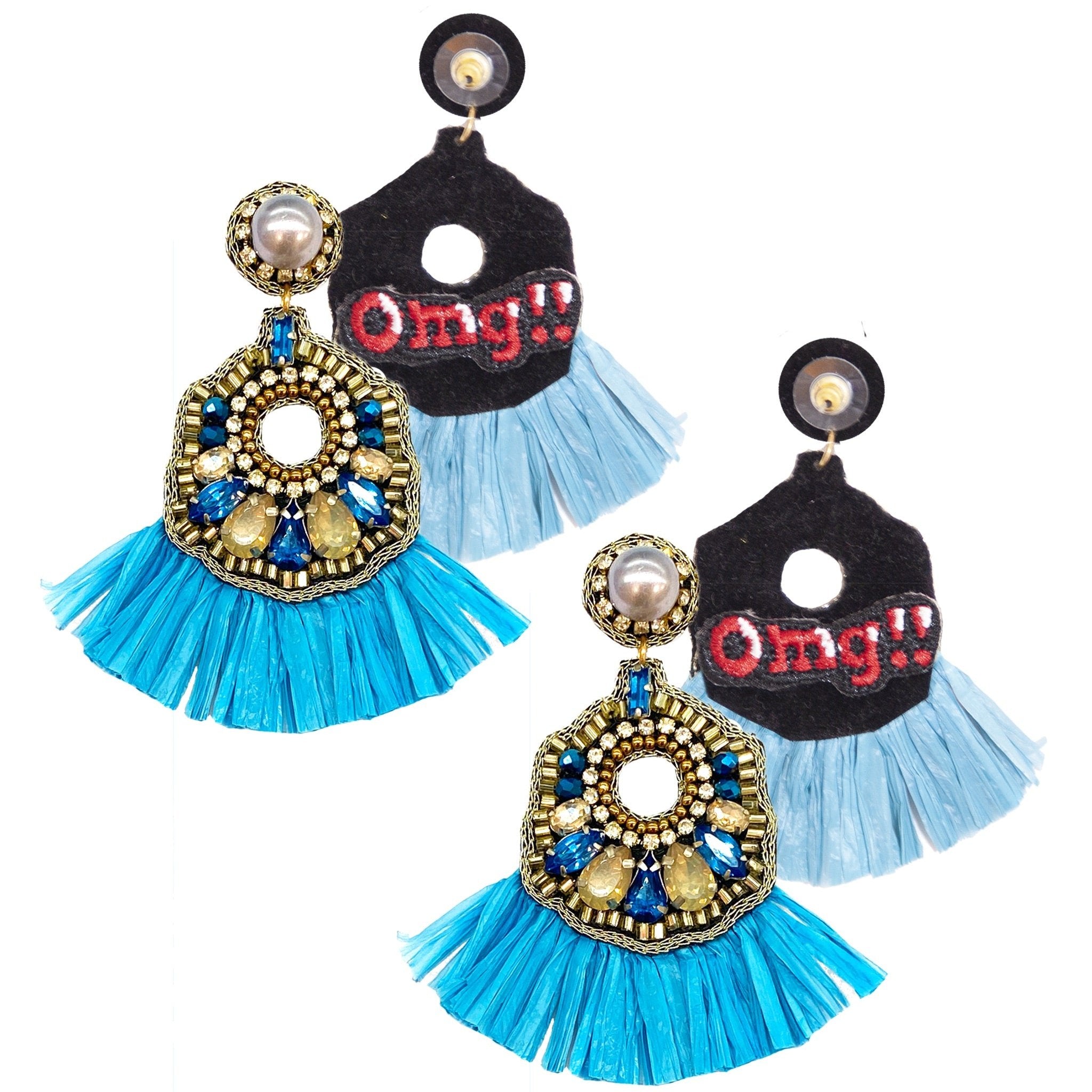 Unique Design: The Blue Crush Earrings feature a striking mix of gold and blue rhinestones, gold trimming, and a playful "OMG" patch.