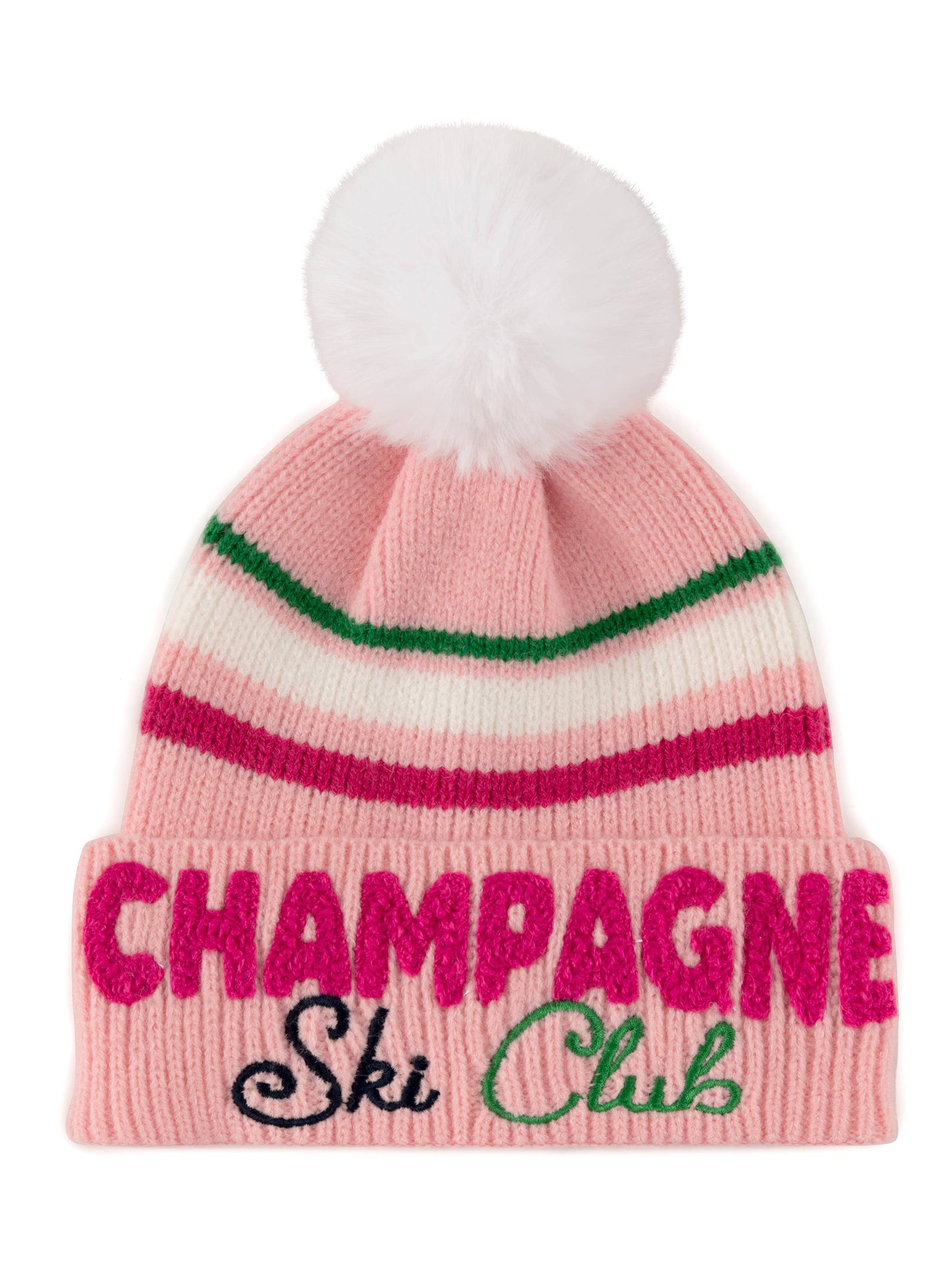 This stylish pink beanie features playful "Champagne Ski Club" embroidery and a fluffy pom pom on top, perfect for keeping you warm during winter outings. Made from high-quality knitted fabric, it adds a fashionable touch to any winter outfit, making it a must-have accessory for cold weather.