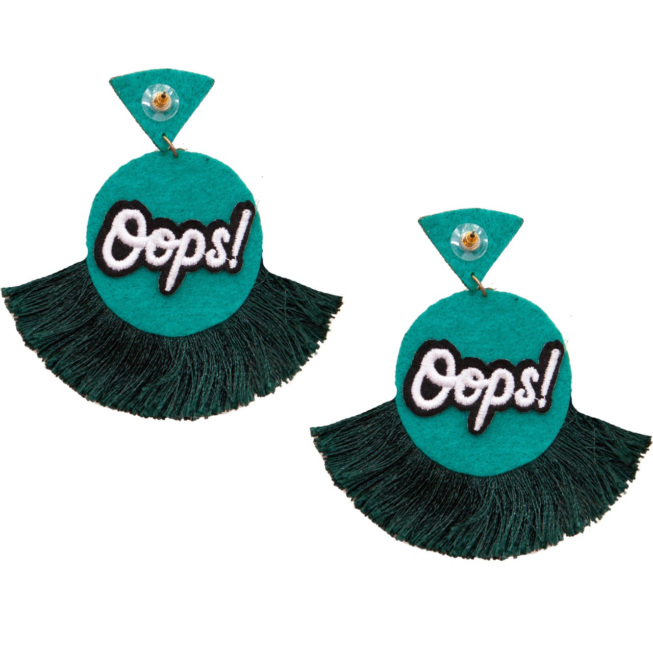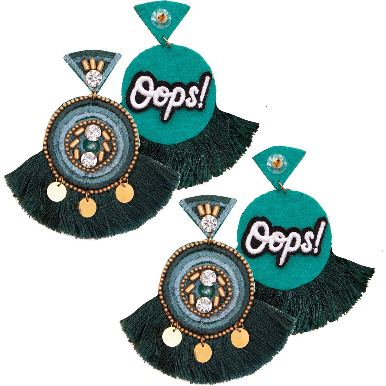 Stunning Green Design: 🌟 Featuring a beautiful green design with Aztec-inspired patterns and playful "Oops!" patches, these earrings add a touch of bohemian elegance to your look.