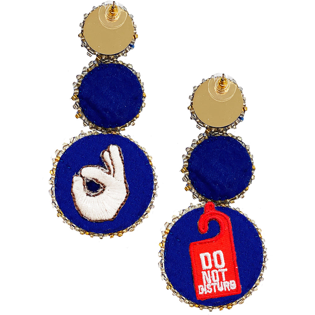 Unique Design: The Disco Drop Blue Earrings feature a striking arrangement of three beaded circles with a playful "Do not disturb / OK! ;)" patch.