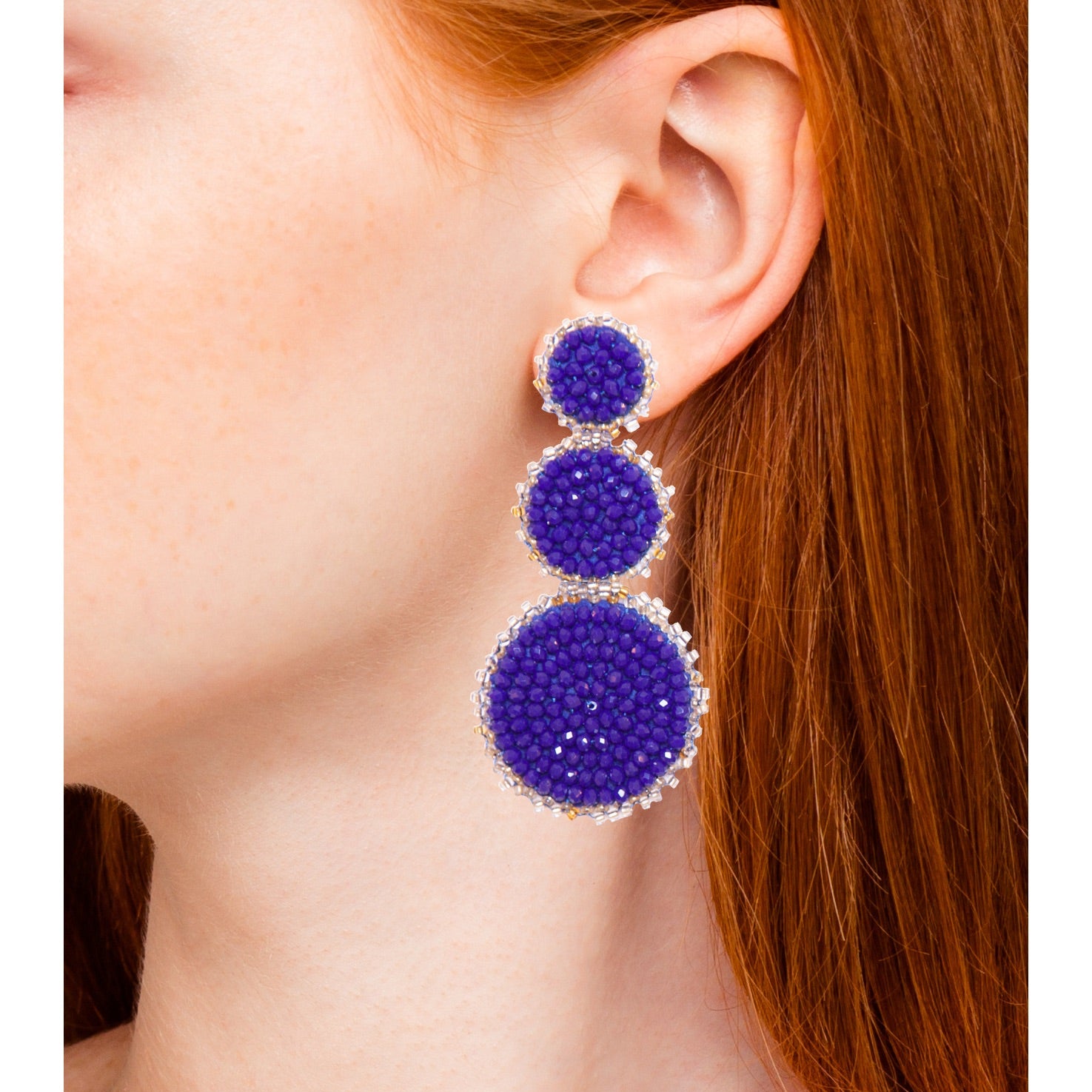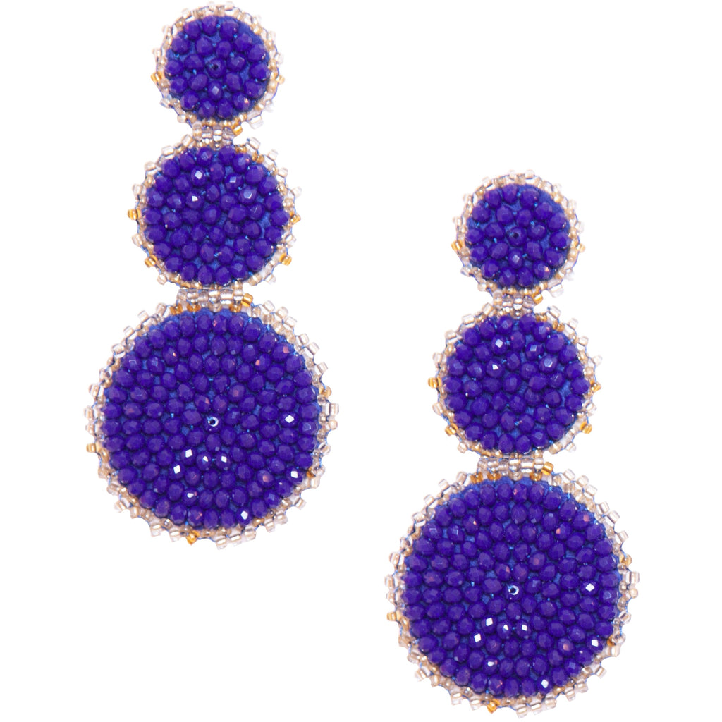Triple the clusters, triple the elegance. Outdo yourself with our stunning Disco Drop earrings. Our set is an aesthetic arrangement of three beaded circles in increasing sizes, available in an array of colors. These hypoallergenic, handcrafted earrings measure 3.25 inches by 1.5 inches and weigh 9 grams.