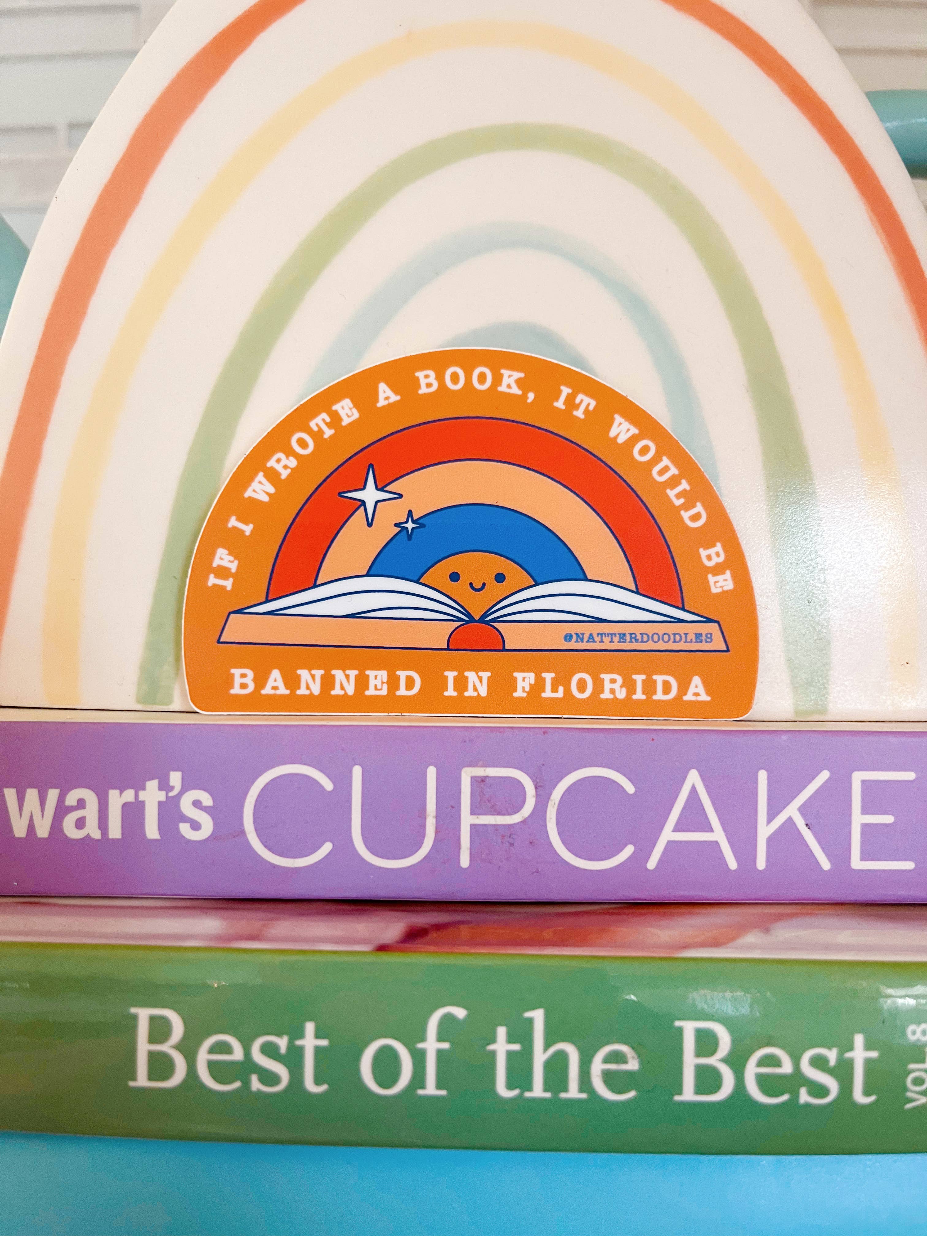 This vibrant sticker features a whimsical rainbow and a playful message, "If I wrote a book, it would be banned in Florida." Perfect for adding a touch of humor and color to any notebook or laptop, this fun sticker is a delightful accessory for anyone who loves unique art.