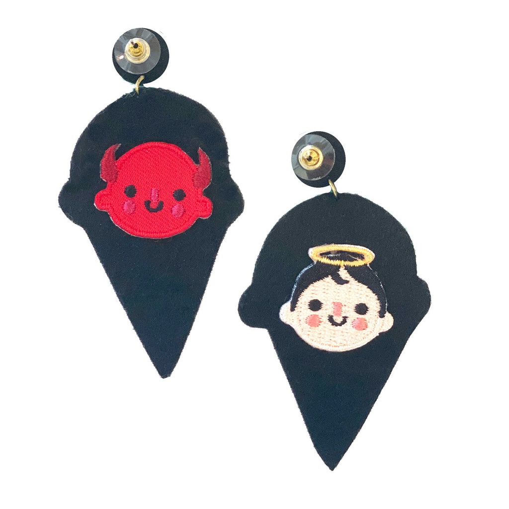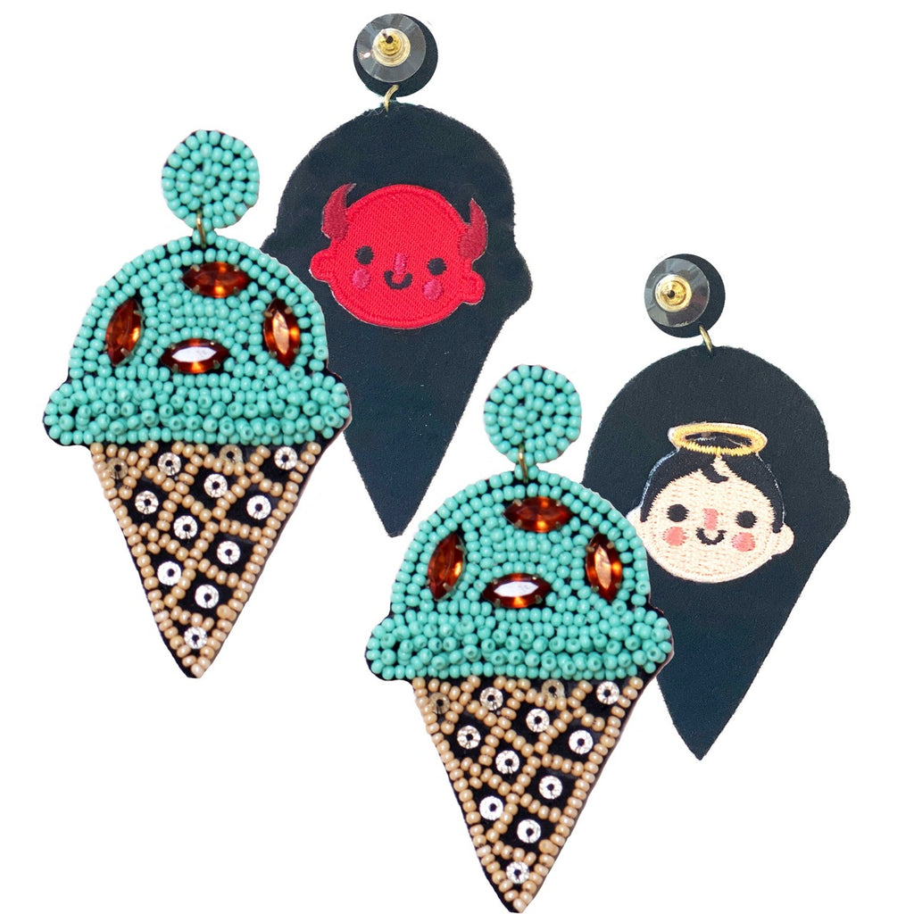 I scream, you scream, we all scream for ice cream! These playful, beaded earrings are a delightful tribute to all ice cream enthusiasts. Featuring mint ice cream cones with raspberry gemstone toppings, these statement earrings add a fun twist to any outfit. Each cone is lovingly crafted with vibrant beads, and as a bonus, you get a special patch design featuring a devil and angel.