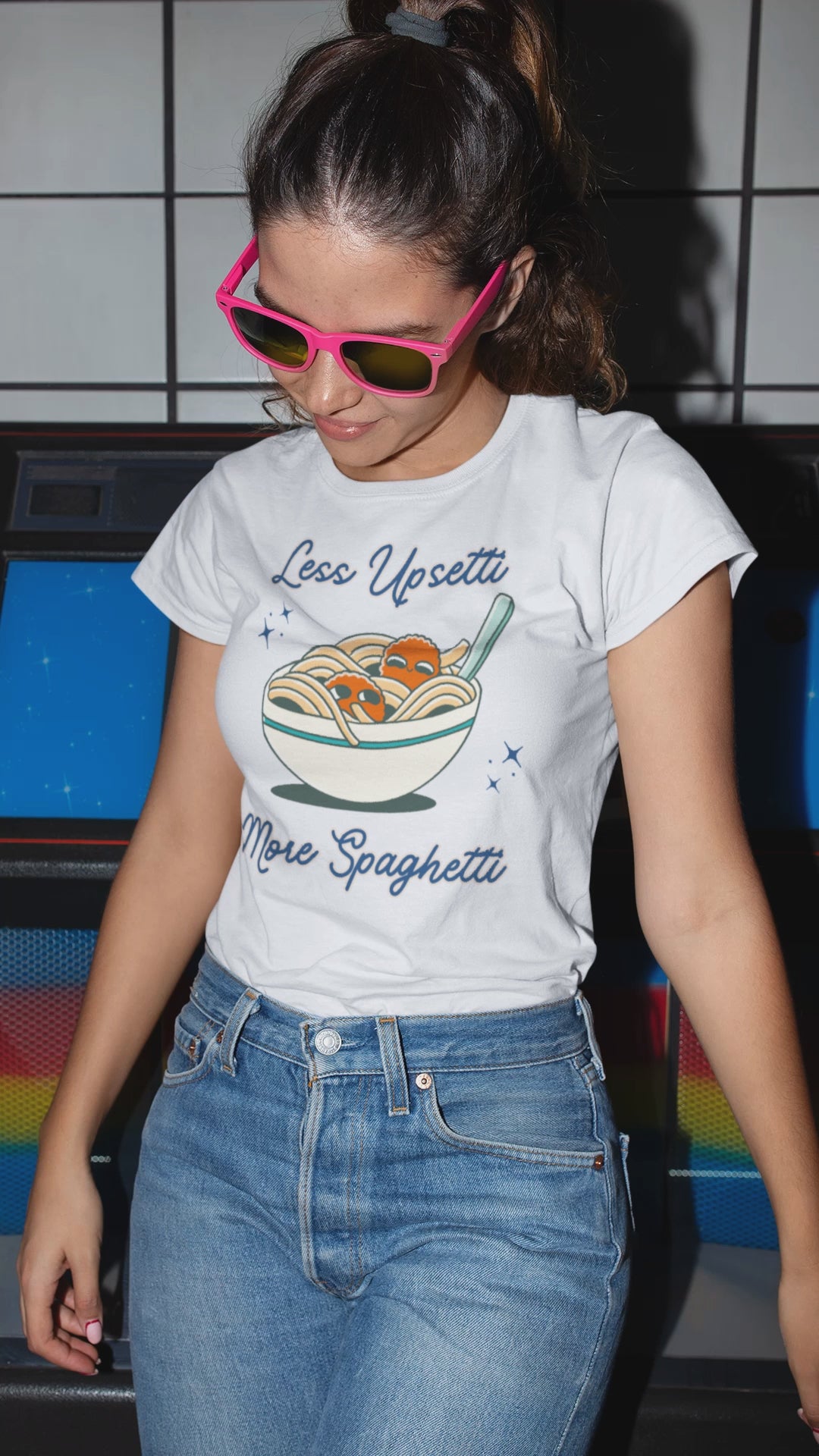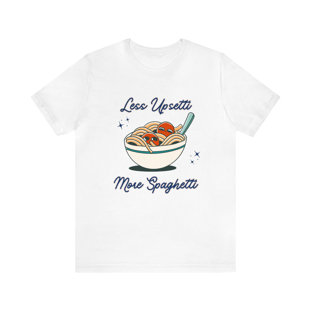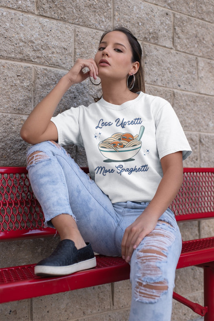 Pair this "Less Upsetti More Spaghetti" T-Shirt with your favorite jeans and sneakers for an effortless, laid-back look. Add a denim jacket and some layered necklaces to elevate your style for a casual day out. This tee is also perfect for cozy days at home paired with joggers or shorts.