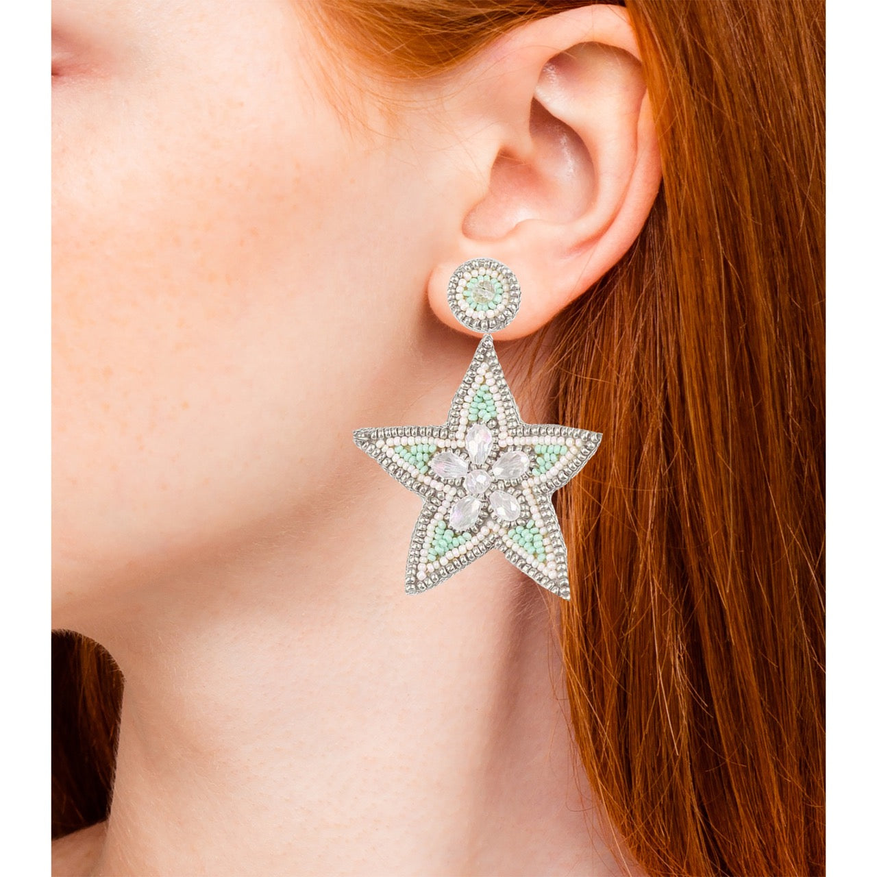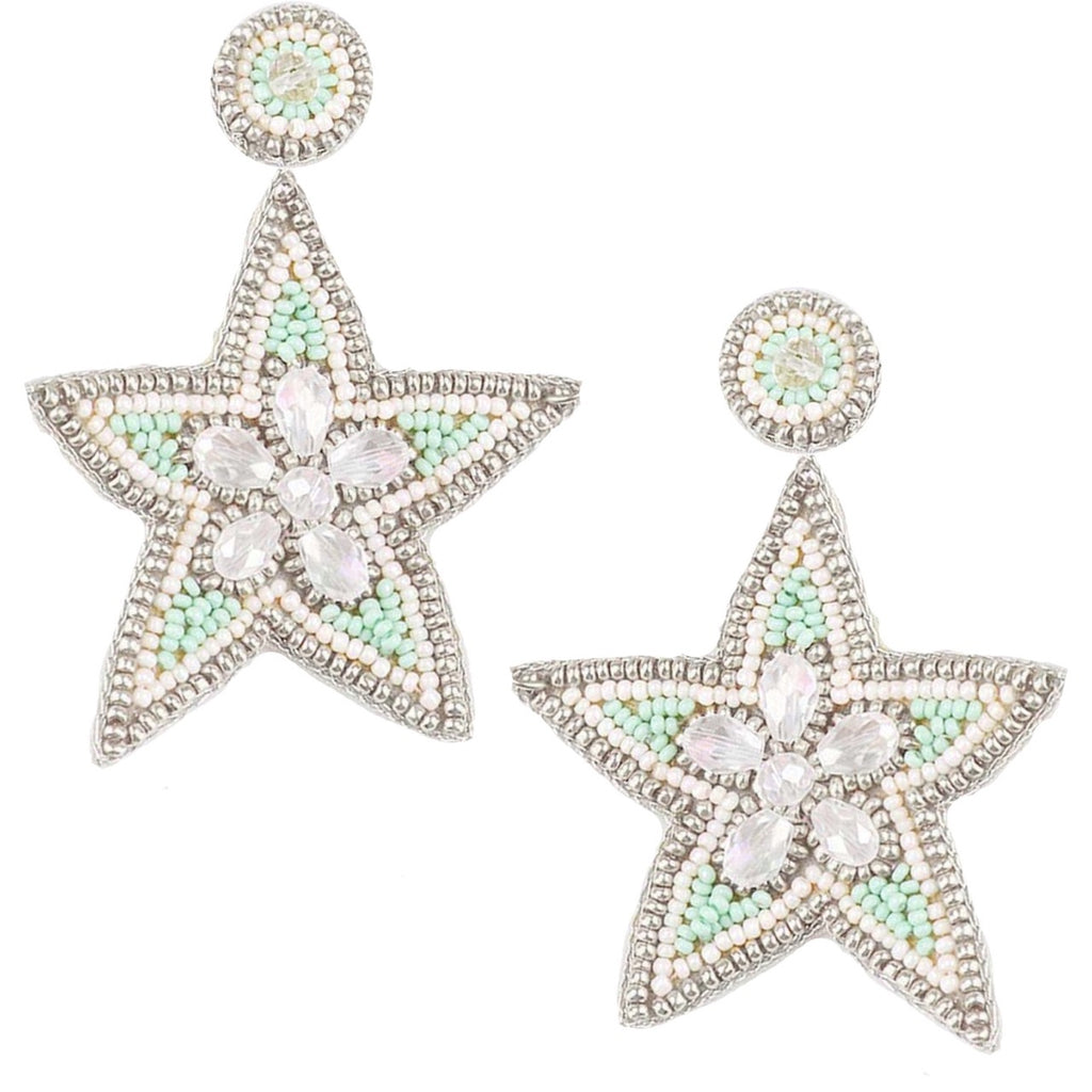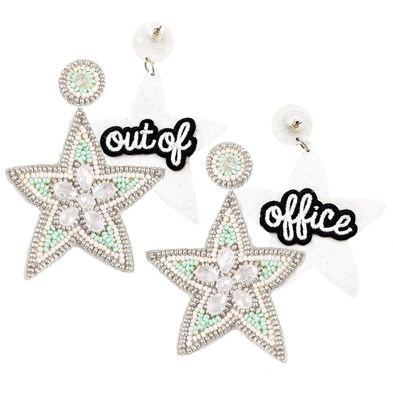 These Ocean Tropic Earrings are designed to make your wishes come true with their enchanting shooting star design. Crafted with sparkly rhinestones in the center and detailed with light mint-colored, white, and silver beading, these statement earrings radiate elegance. Each pair features a unique "Out of Office" patch design on the back, making them both stylish and playful. Lightweight and easy to wear, these earrings add a touch of sparkle to any outfit.