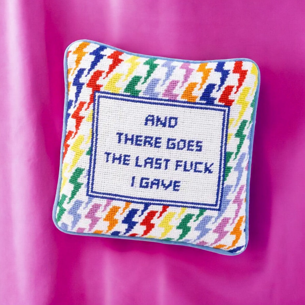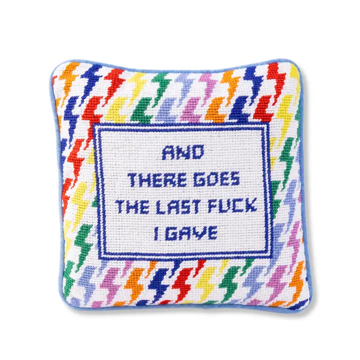 Bring a touch of humor to your home decor with the "There Goes My Last F*ck" Needlepoint Pillow. This colorful and witty throw pillow features a bold needlepoint design with a hilarious quote that’s sure to catch attention and spark conversation. Perfect for adding personality to any space or gifting to a friend who appreciates a good laugh.