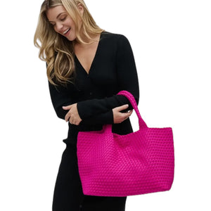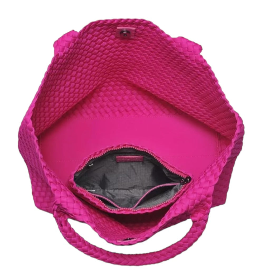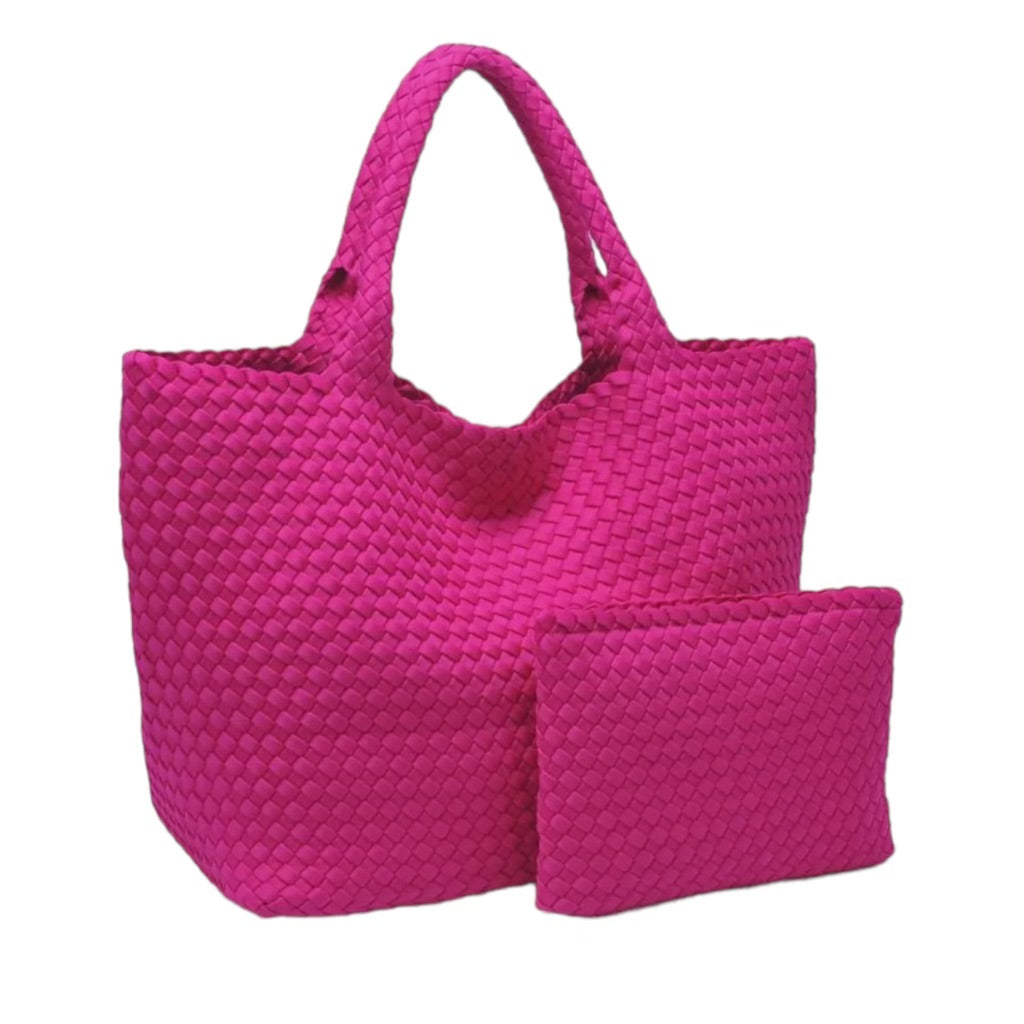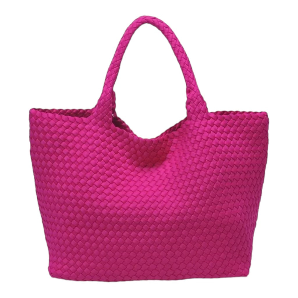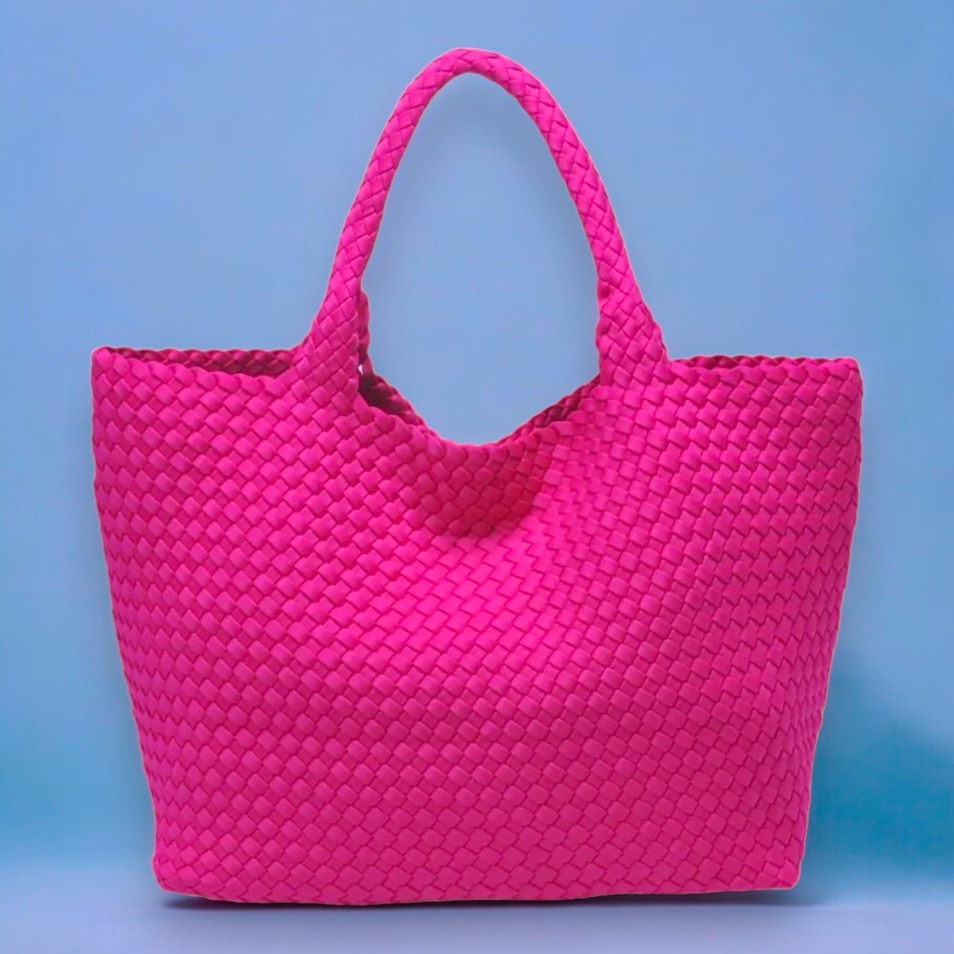Carry your essentials in style with the Basketweave Pink Tote! Made with a unique basketweave design, this tote adds a playful touch to any outfit. Its spacious interior offers plenty of room for your belongings, making it perfect for any day.