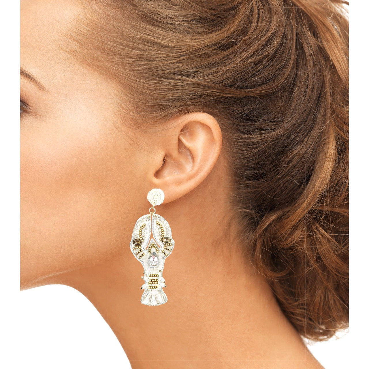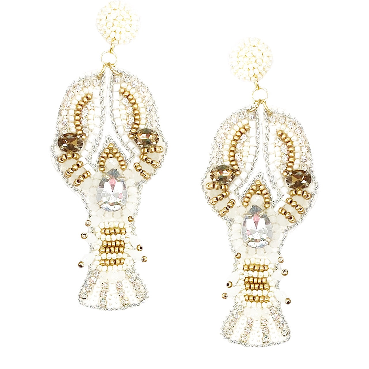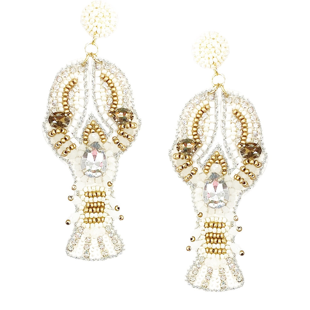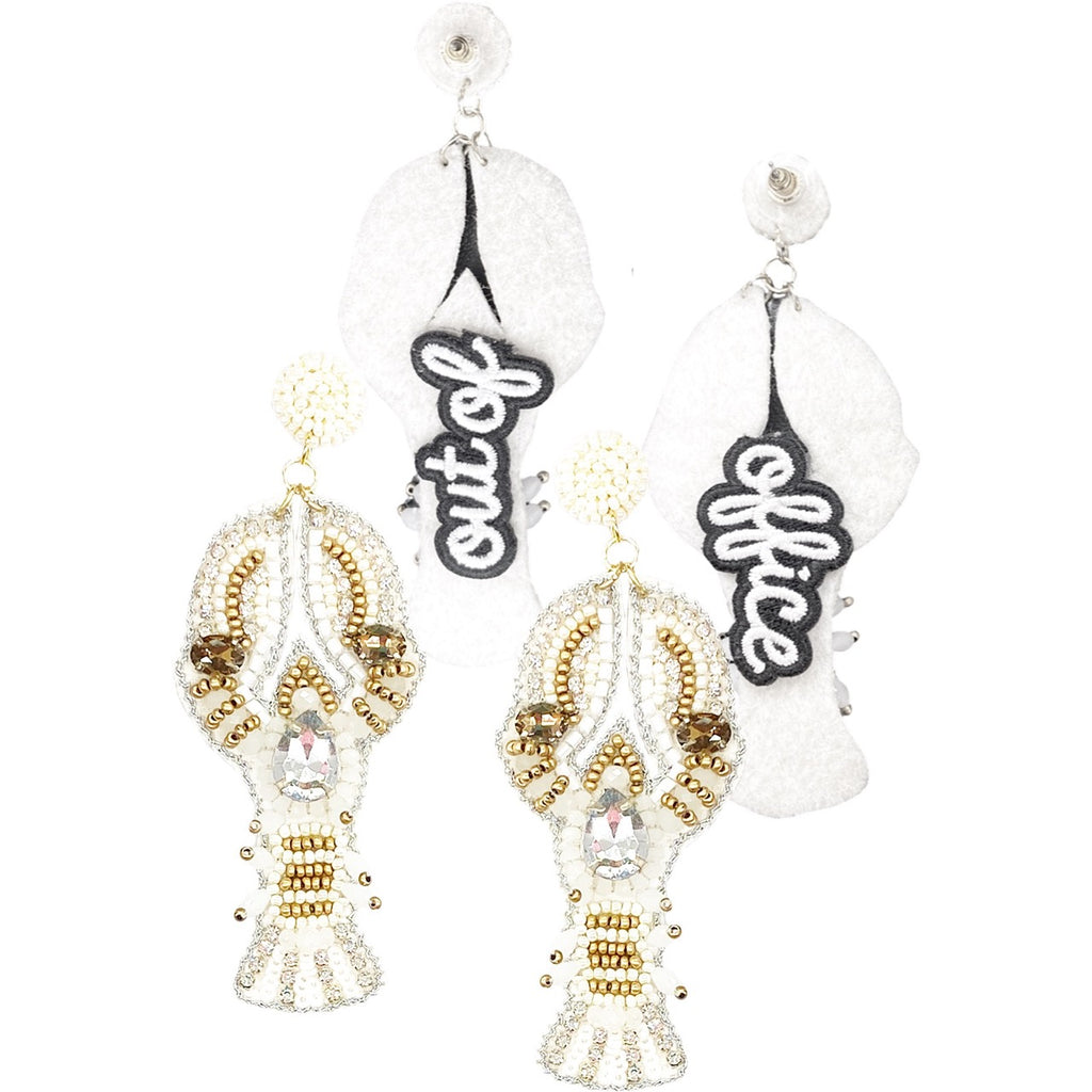 Our "Bedazzled Lobster Ivory Earrings" are a must-have addition to your jewelry collection. Adorned with white and gold beading and sparkling rhinestones, these earrings offer a glam finish perfect for any outfit. Hypoallergenic and hand-crafted, they promise style without compromise. Lightweight and comfortable, they ship in 3-5 business days. No tools needed—just pure enjoyment!