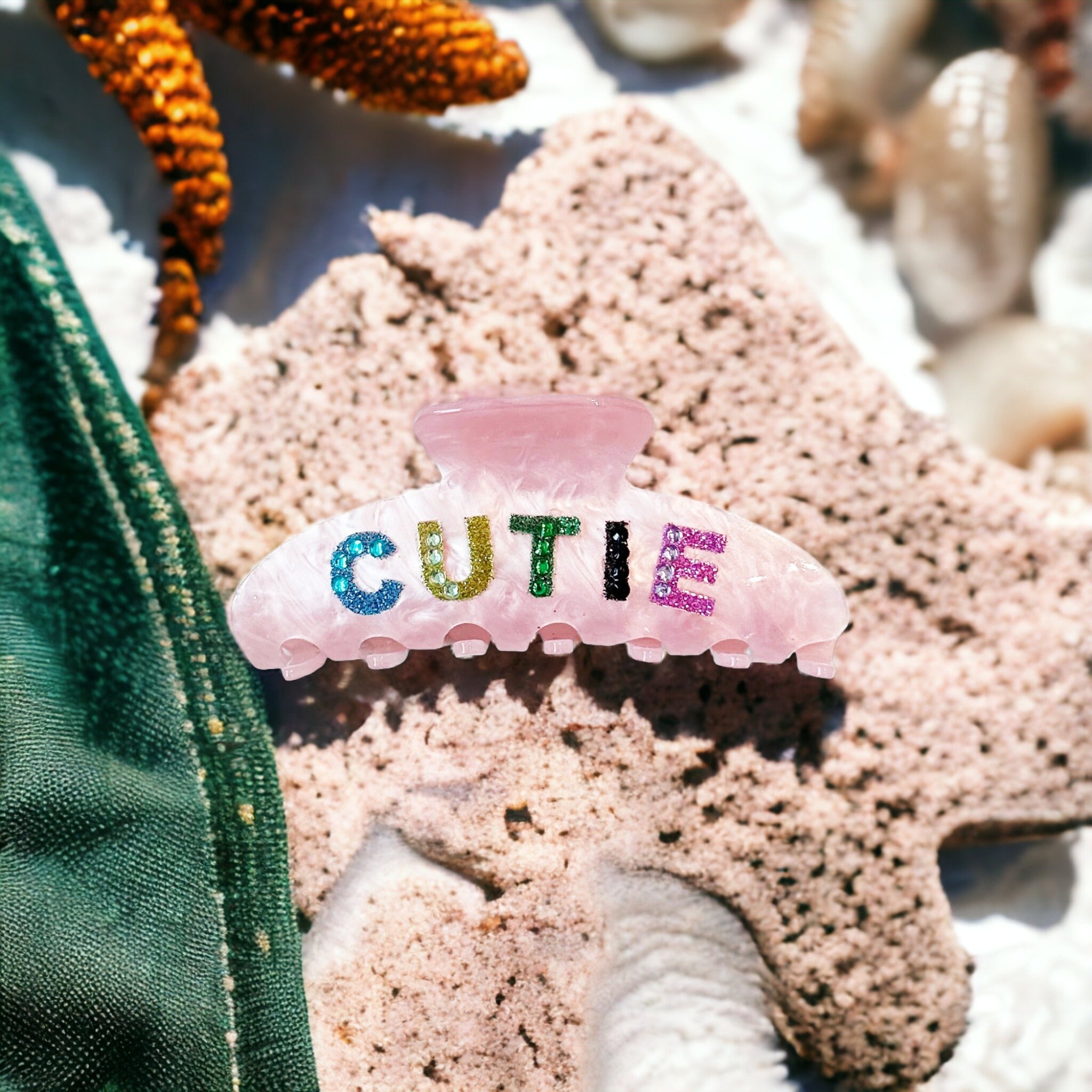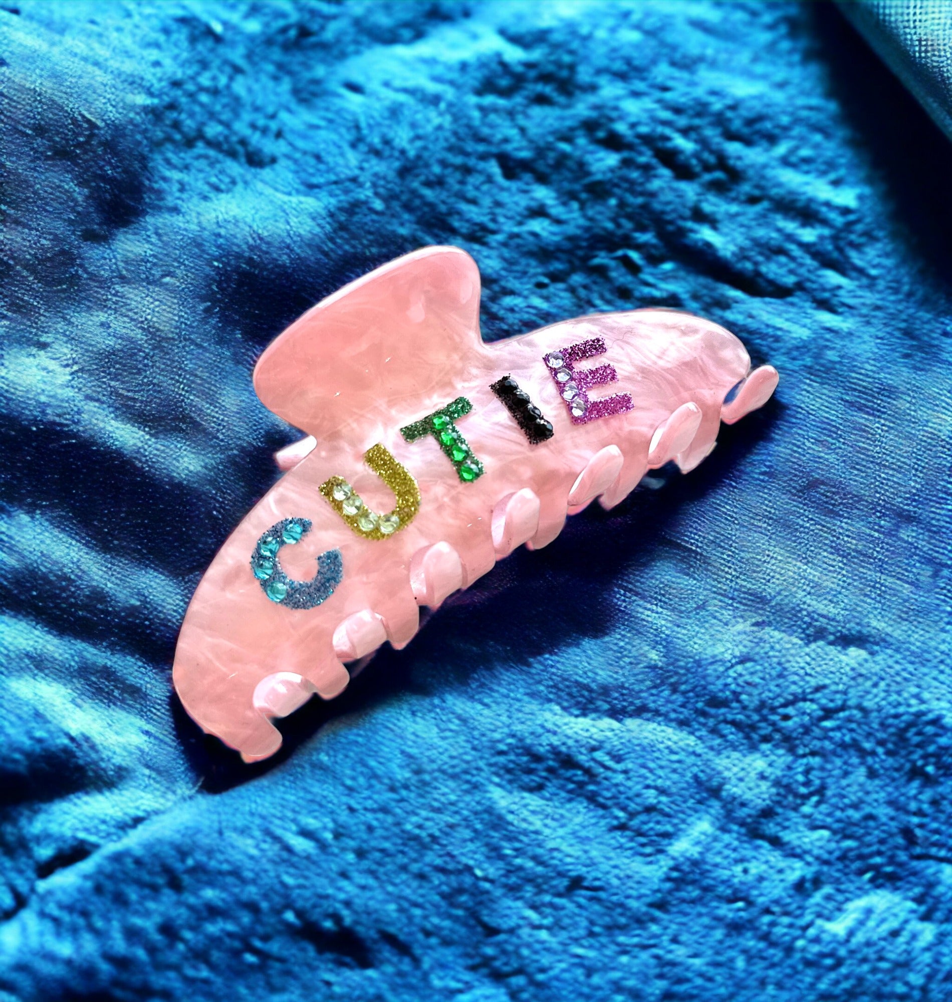 This sassy "CUTIE" Hair Clip is your ultimate hair accessory! It comes with a striking pink hue and shimmering multi rhinestone lettering — an effortlessly stylish way to add life to any 'do. Stand out from the crowd and show off your unique style with this one-of-a-kind hairclip.